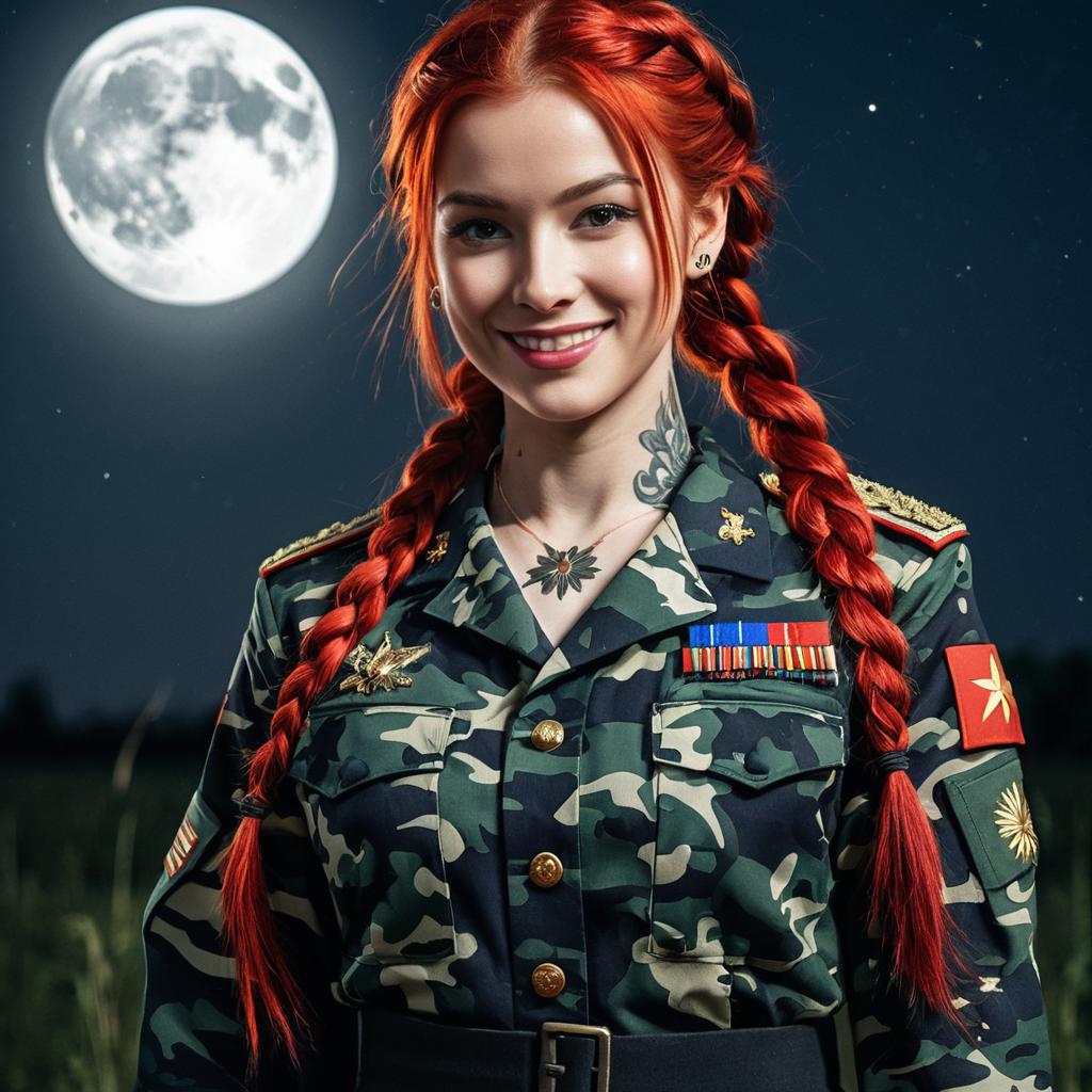 Tattoo Art anime style:3, female soldier, ((red braided hair)), ((camouflage uniform)), standing, ((hyper quality)), ((detail face)), ((detail eyes)), bloom wind, moon light, dress, (highly detailed), ((determined smile)), ((full body)), muscular build, ((Russia))
