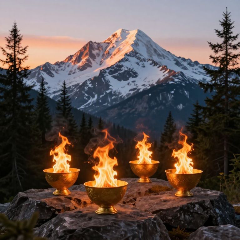 Four golden chalices rest on a rocky outcrop, each emitting swirling flames as they sit before a majestic snow-capped mountain bathed in the warm glow of a setting sun, surrounded by a dense forest of evergreen trees.