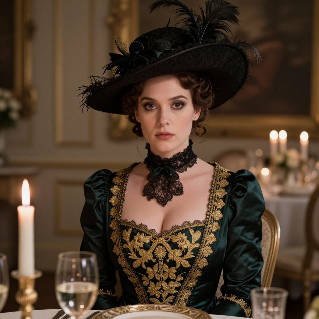 A close-up of a woman in a lavish British-themed party outfit inspired by the 19th century—dark green satin dress with gold embroidery, a high lace collar, and a wide-brimmed hat with feathers—sitting at a dinner table in a grand manor house, candlelight reflecting off the table, her face is pale, delicate, with a classic English complexion and deep brown eyes, looking regal and content.. The woman has big tits and cute face