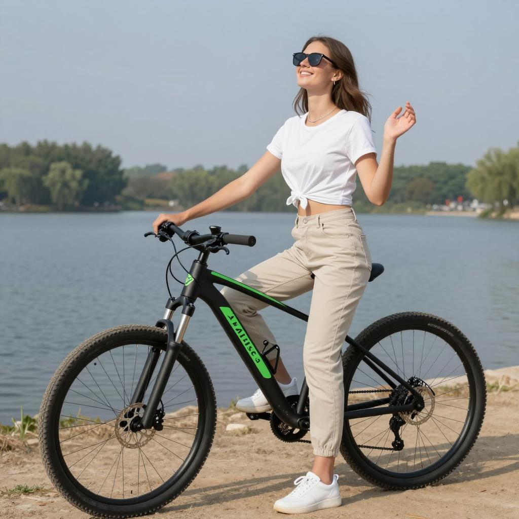 Two women on a wooden dock with bicycles. Both wear white bikinis and sunglasses. One woman rides a bicycle with a decorated front basket, the other rides another bicycle. Wooden houses on stilts in the background. Water in the foreground. Bright sunlight. One woman smiles. Both have long hair. They look to the right. Wood ure under their feet. Blue sky with some clouds.