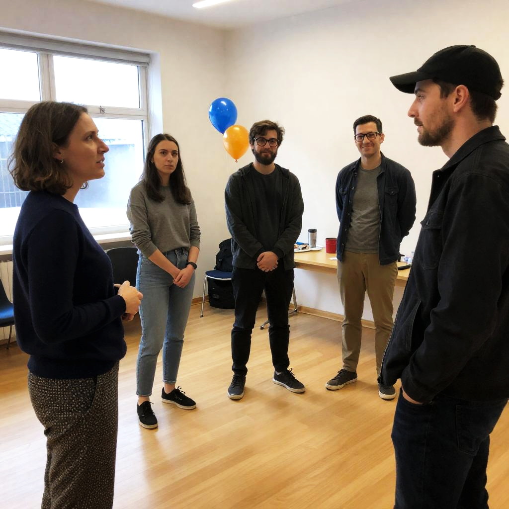 Group of six people in a room. Woman in navy sweater and patterned pants stands speaking to man in black cap, dark jacket. Three others sit or stand in background. Balloons and table with items in background. Casual clothing. Light, wooden floor. Natural light from windows. Woman with short brown hair, intense expression. Man with beard, glasses, relaxed expression. One woman with long dark hair, neutral expression. One man with glasses, slight smile. Casual, conversational atmosphere.