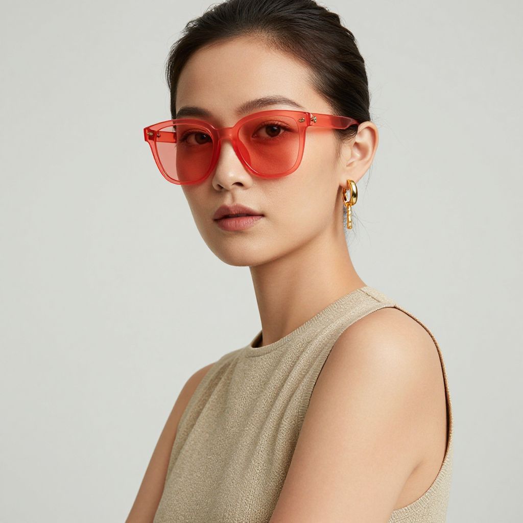 Fashionable woman wearing vibrant coral sunglasses, gold jewelry, and a sleeveless top, exuding confidence and style against a minimalist background.
