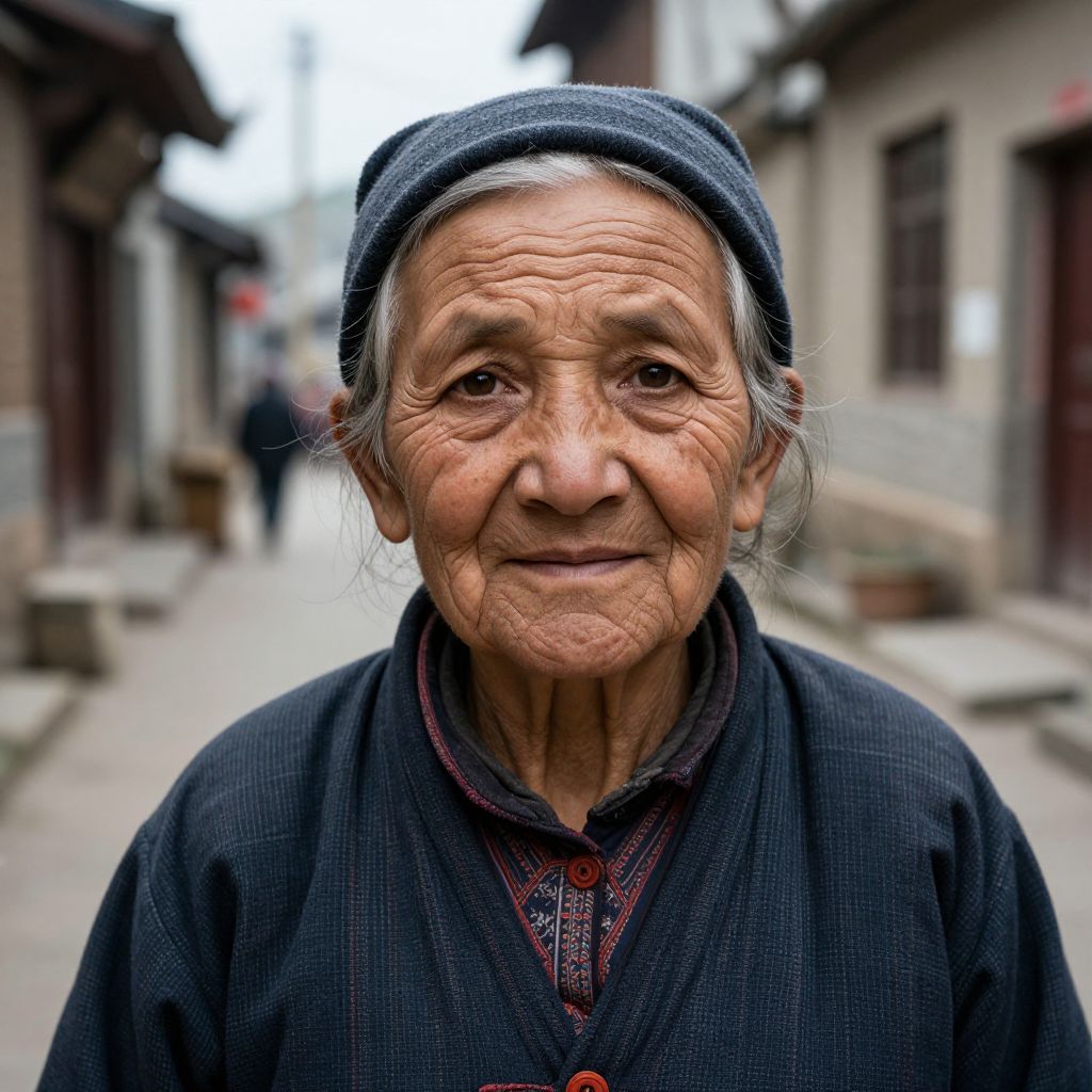 Portrait of a wrinkled old woman with deep expressive lines, wearing traditional clothing, set against a backdrop of an old village street, faded colors with high realism, capturing the essence of wisdom and resilience in her gaze