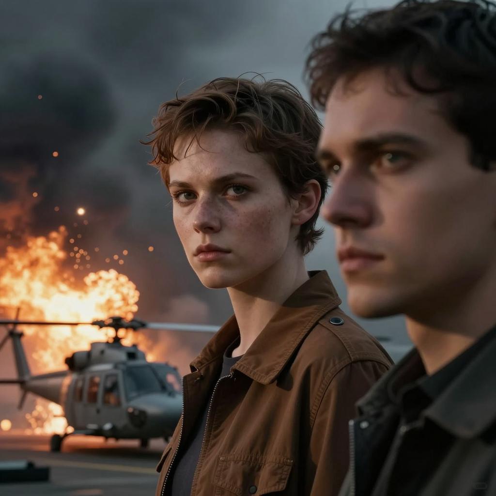 A young woman with short blonde hair, wide eyes, and a worried expression. She extends her right hand forward, palm open, with a blurred, illuminated light in the foreground. A large, partially obscured, shadowy face is in the background. Two people. Warm lighting on the woman, cool lighting on the background face.