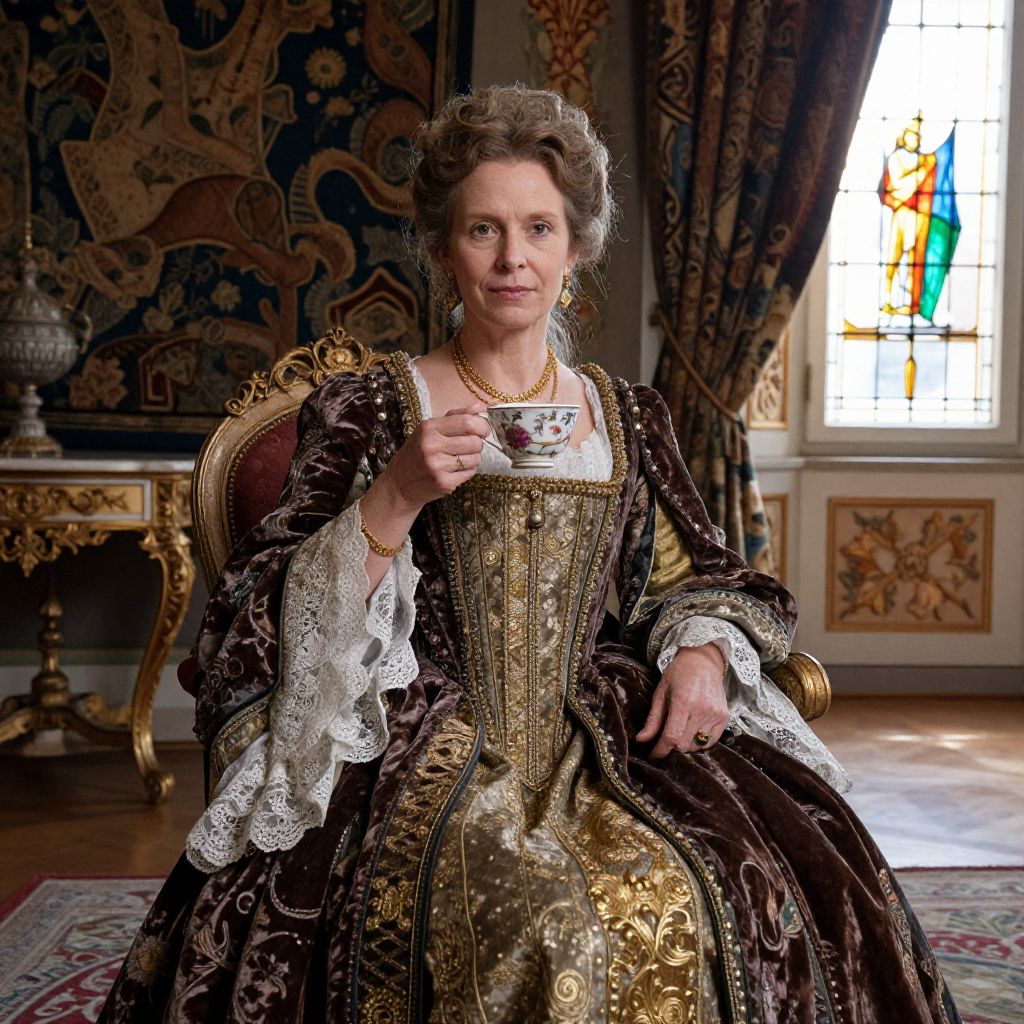 Vladimirovna styled as a renaissance-era noblewoman, seated in a grand ornate room filled with tapestries and antique furniture, dressed in luxurious velvet and lace garments with golden accents, holding a delicate porcelain cup, soft natural sunlight filtering through stained glass windows.