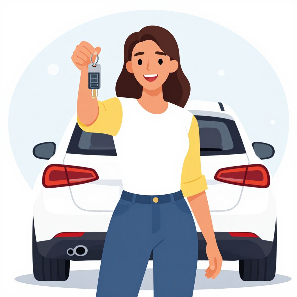 Digital illustration of a smiling woman with light skin and brown hair, wearing a white short-sleeve shirt and dark blue pants. She holds up a car key in her right hand. In the background is a white car with red tail lights and black trim, slightly blurred. The image uses bright, flat colors and simple shapes, with a clean, cartoonish style. The woman is centered in the foreground, while the car occupies the background, creating a sense of depth. The overall composition is cheerful and celebratory.