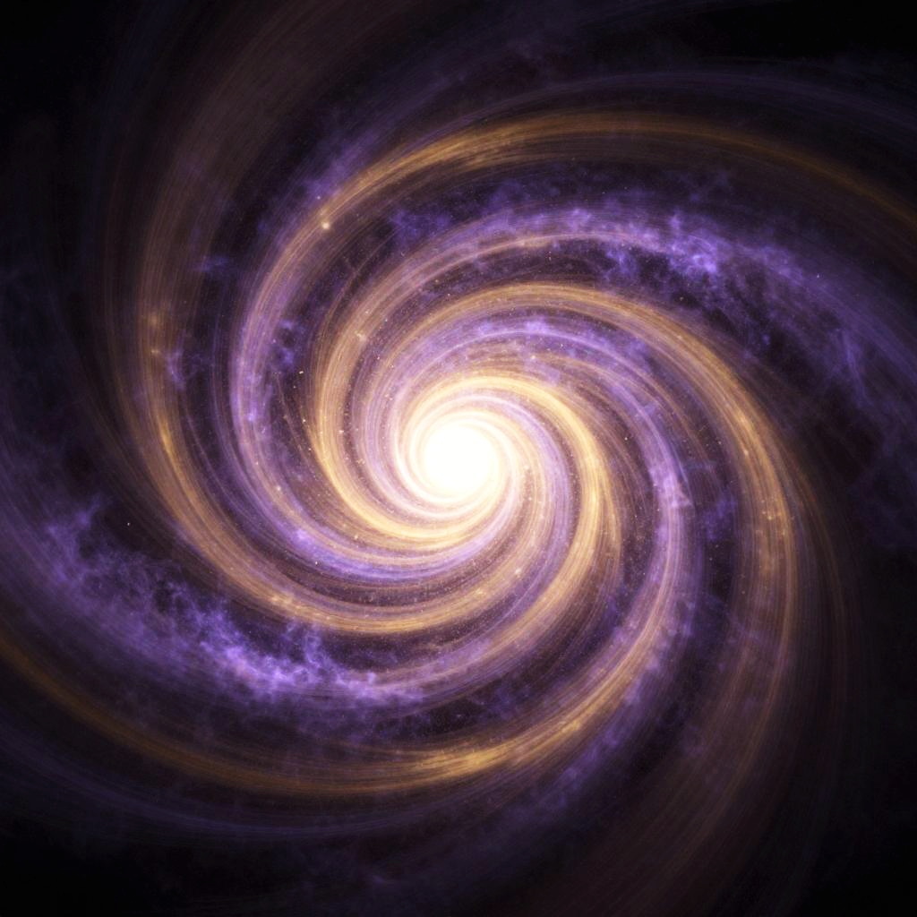 Zyklus illustrated as a cosmic energy cycle, swirling rings of light and particles revolving around a glowing core, radiant purples and golds dominate, digital art with dynamic motion blur and a sense of infinite flow.