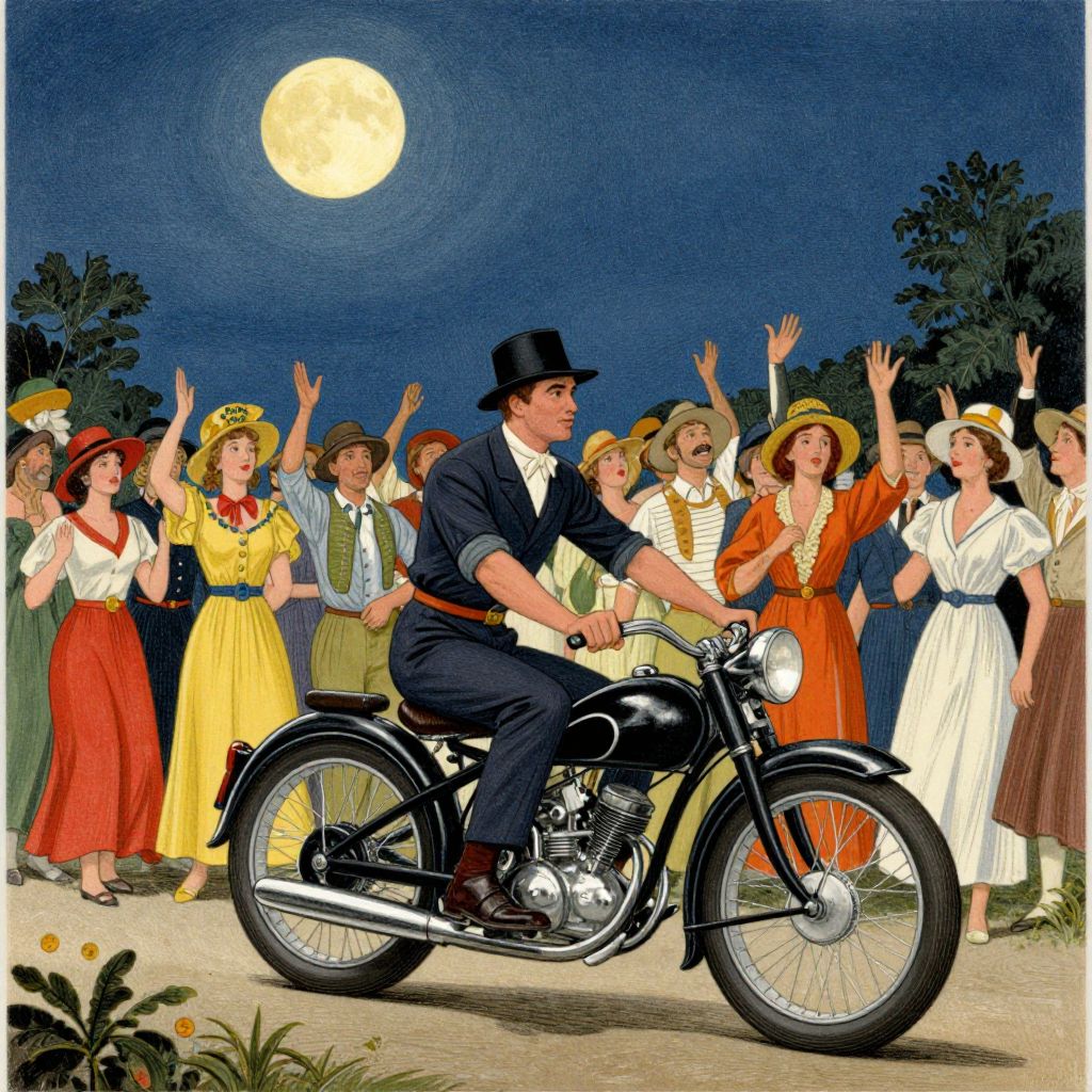 Vintage illustration: Man in black suit and top hat rides black motorcycle under full moon, surrounded by cheering women in colorful 1920s dresses.