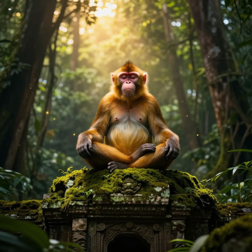 Photorealistic digital artwork of a monkey sitting on a moss-covered, ancient stone structure in a dense, sunlit forest. The monkey, with orange and brown fur, a white chest, and a pink face, sits with legs crossed and hands resting on its knees. Light filters through the trees, creating a glowing backdrop. The stone structure is adorned with intricate carvings and covered in green moss, adding texture to the scene. The monkey's expression is calm, and the forest around is lush with various shades of green.