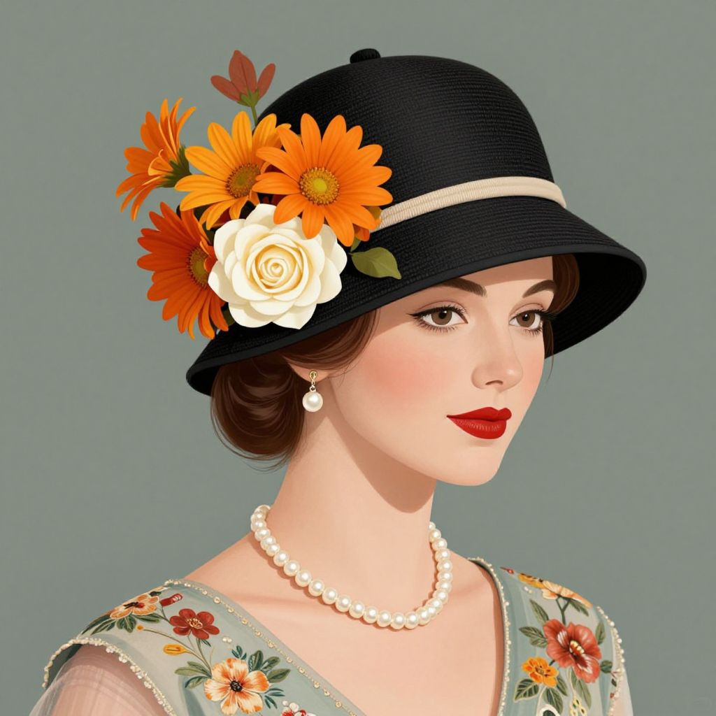 A high-definition digital illustration depicts a vintage 1920s cloche hat adorned with vibrant fall flowers, including orange daisies and white roses, worn by a woman dressed in a retro-style dress with floral embroidery and a pearl necklace, evoking a classic and elegant aesthetic.