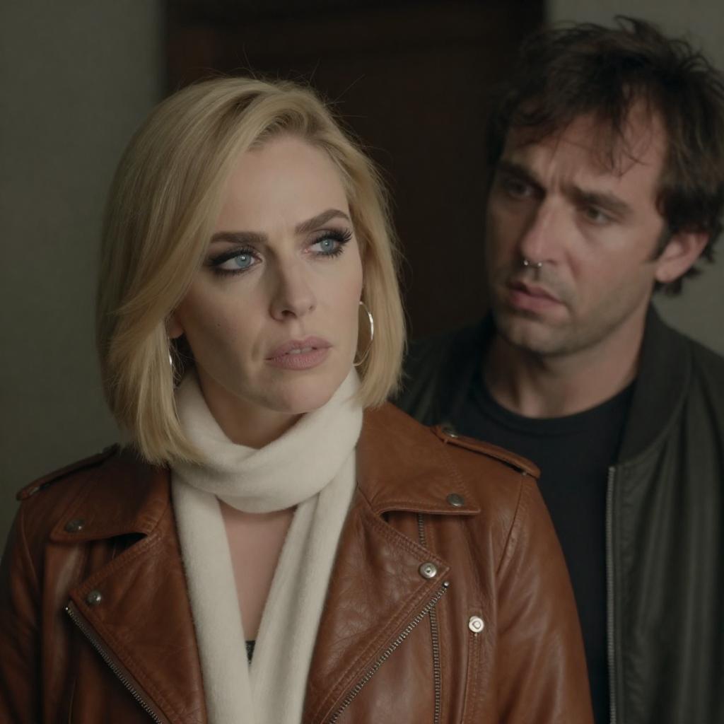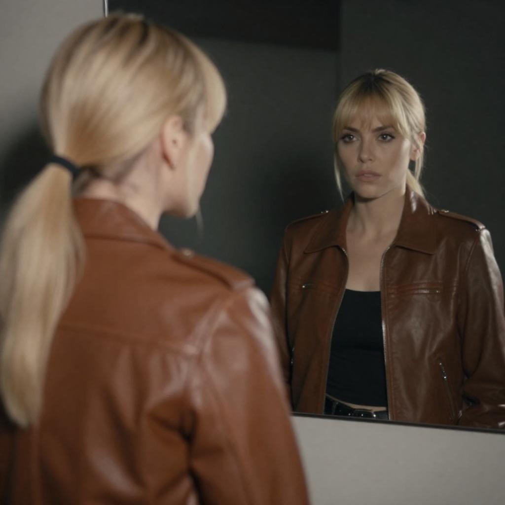Photograph of a blonde woman with bangs and a brown leather jacket, standing in front of a mirror. She gazes at her reflection with a serious expression. Her hair is in a ponytail, and her back is to the camera. The mirror shows her face and upper body. Dim, grainy lighting. Reflection of her face in the mirror is slightly blurred. Dark background.