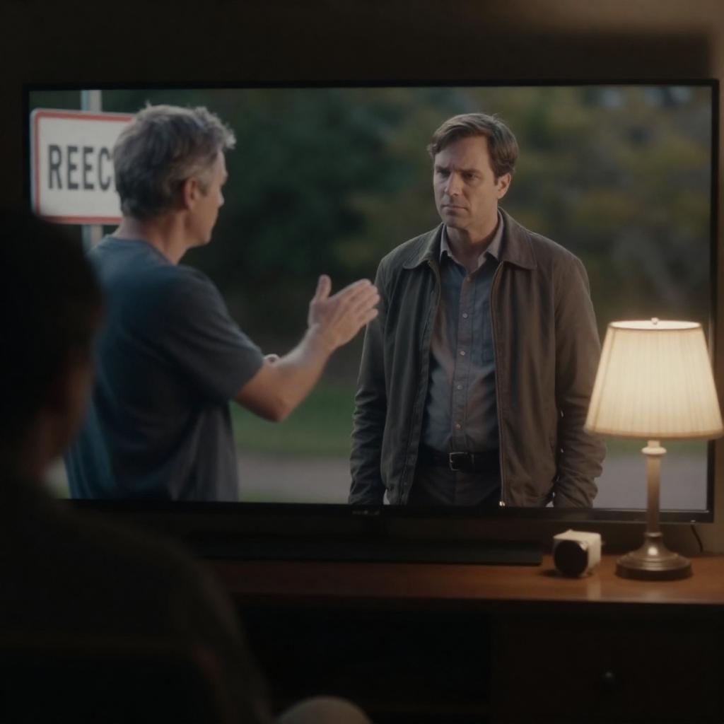 Photograph of a TV screen showing two men in a dimly lit outdoor scene. One man, with short gray hair, gestures toward a sign. The other man, with short brown hair, stands with a serious expression. Right side shows a lamp with a pleated shade on a desk. Silhouetted person in the foreground.