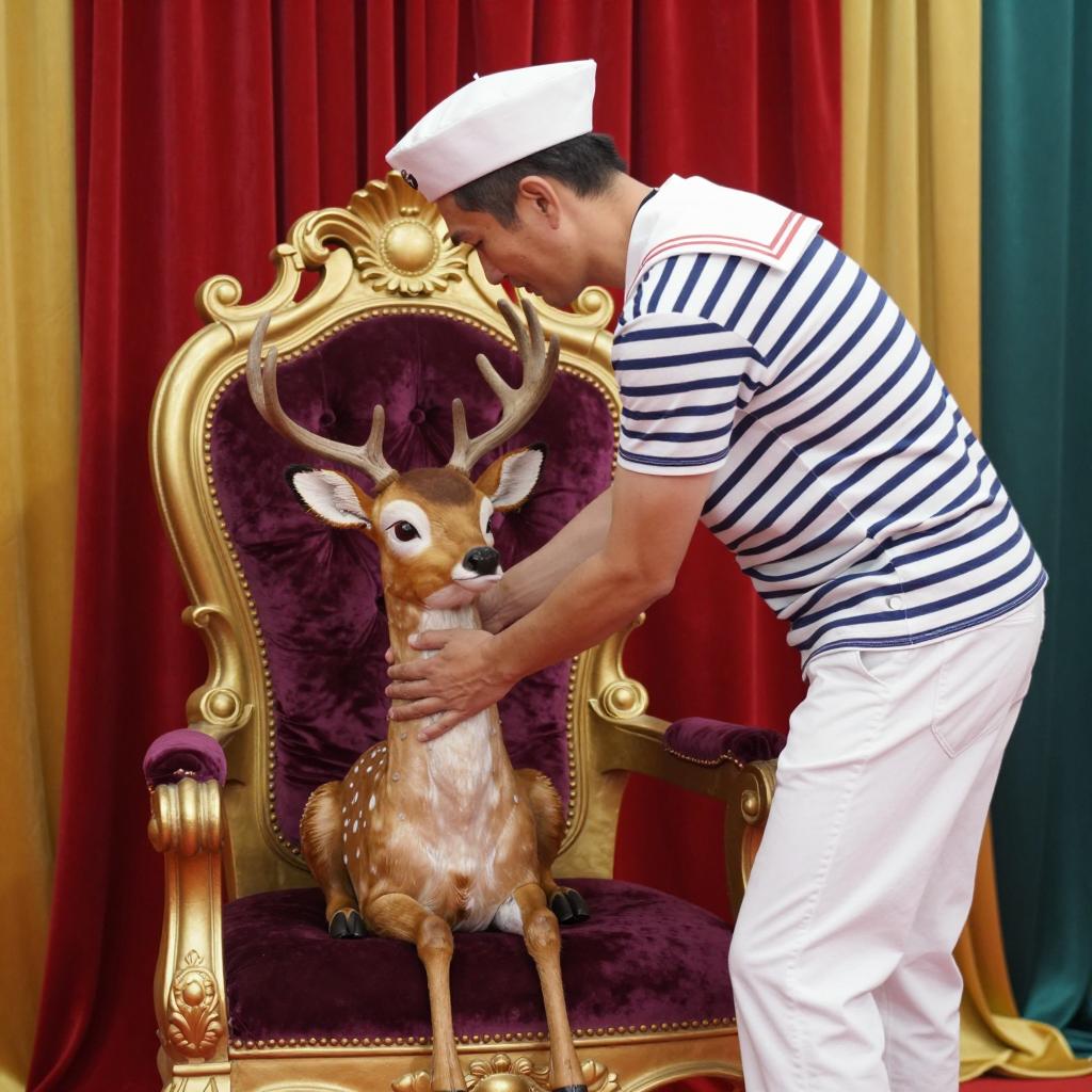 Two men in black top hats and dark suits hold a taxidermied deer. The man on the right speaks into a microphone with a red flower on his lapel. An American flag in the background. The man on the left smiles, holding the deer's neck. Both men have beards. The man on the right has gray hair. The scene is outdoors with bare trees in the background.