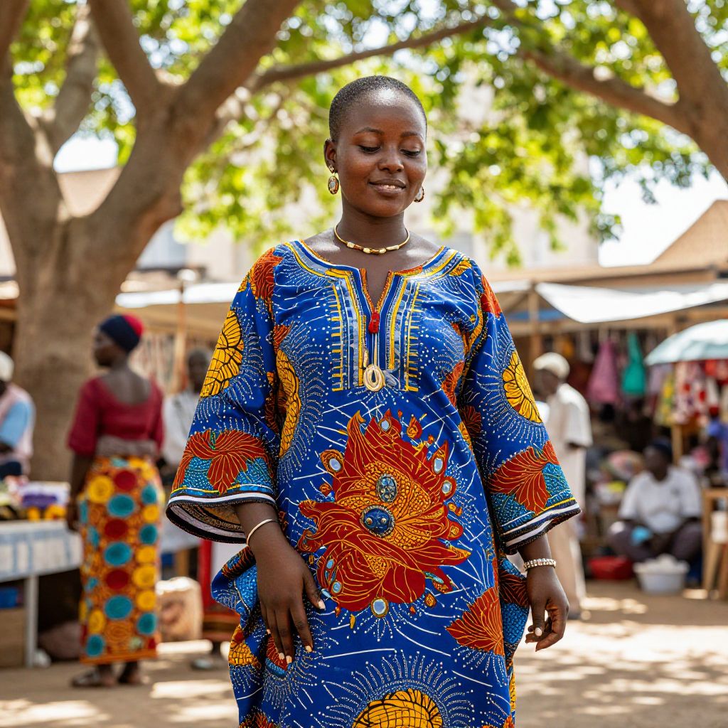 Photograph of a tall, dark-skinned African woman with short, neat hair, standing outdoors in a market. She wears a vibrant blue dress adorned with large, colorful floral patterns in orange, yellow, and white. The dress has a V-neck and white piping along the sleeves. She accessorizes with a pearl necklace and small earrings. Her eyes are closed, and she has a serene smile. The background shows a bustling market with blurred figures, trees, and sunlit stalls. The image has bright, vivid colors and a slightly bokeh effect, emphasizing the subject.