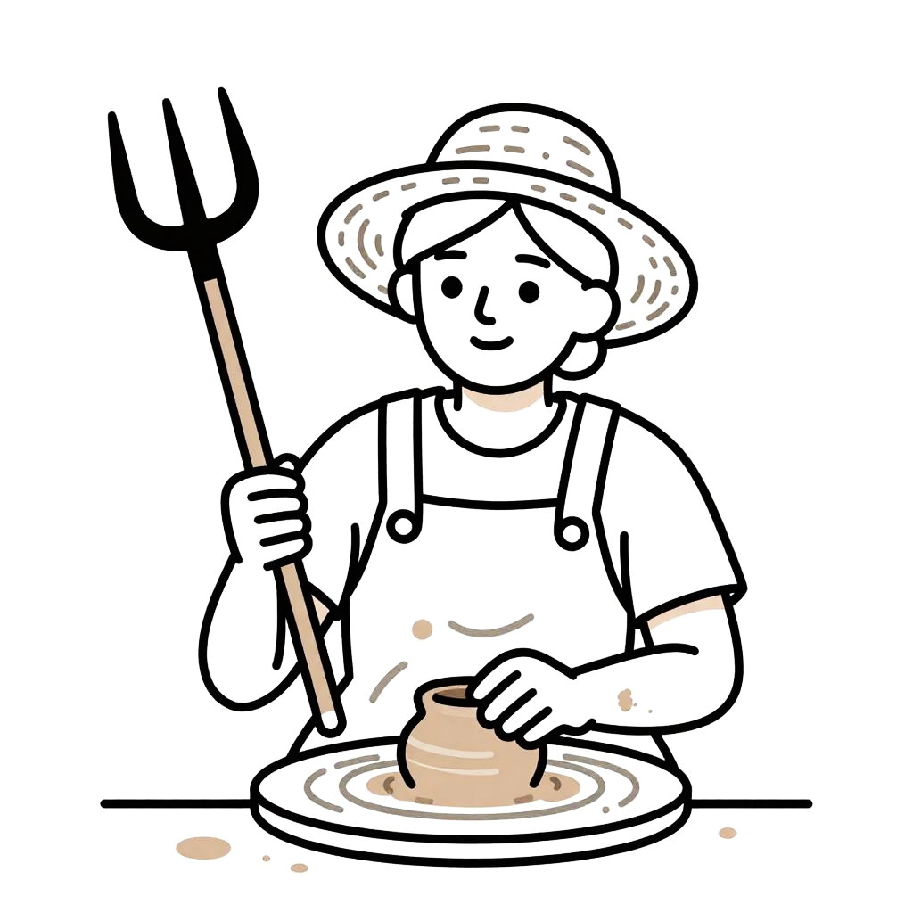 Line art of an elderly potter man wearing a straw hat and overalls, holding a pitchfork, with clay splatters on his arms and apron, sticker-style design, color-block aesthetic, minimal and clear