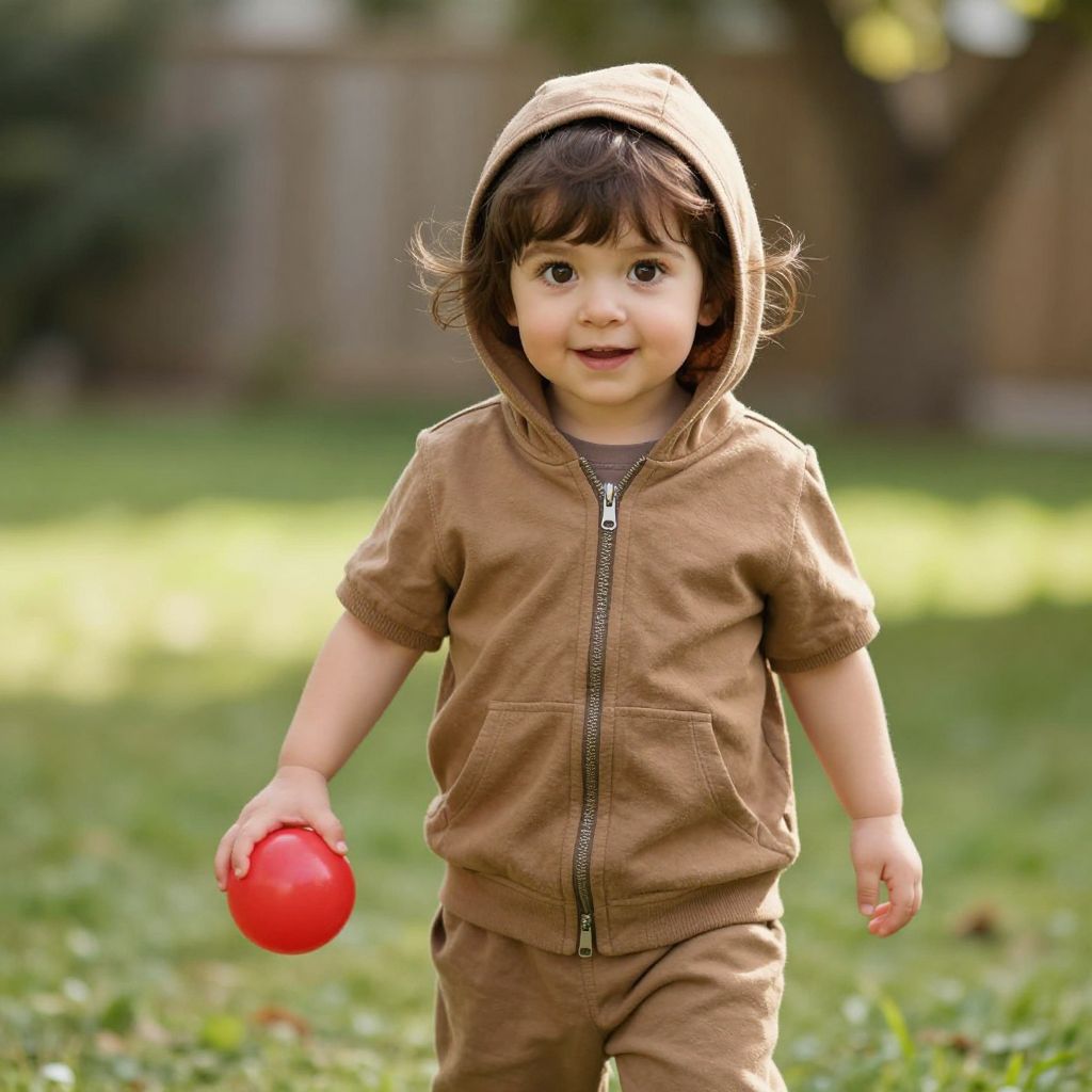 A small child, around 4 years old, is wearing a cozy brown hoodie with a slightly worn zipper, paired with a matching brown cotton outfit that includes a brown short-sleeved shirt and brown pants. The child has messy, dark brown hair, large expressive eyes, and a warm, curious smile. They are standing in a sunny backyard, playing with a red ball, with soft green grass and a tree in the background. The scene is bright and cheerful, capturing a moment of innocent joy and playfulness.