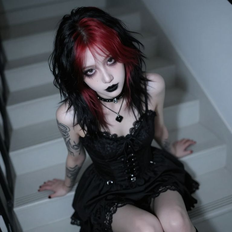 Goth girl with two-tone black and red hair, Short wavy hair, Black lace dress and black choker on her neck, Blackwork tattoo on her arm and black pendant on her neck, Sitting on white stairs, Emo makeup with black lipstick, Looking at the camera, Pale skin and brown eyes, From above, Photograph, higly detailed, atmospheric perspective, dim colors, Depth of field 100mm, Goth GIrl