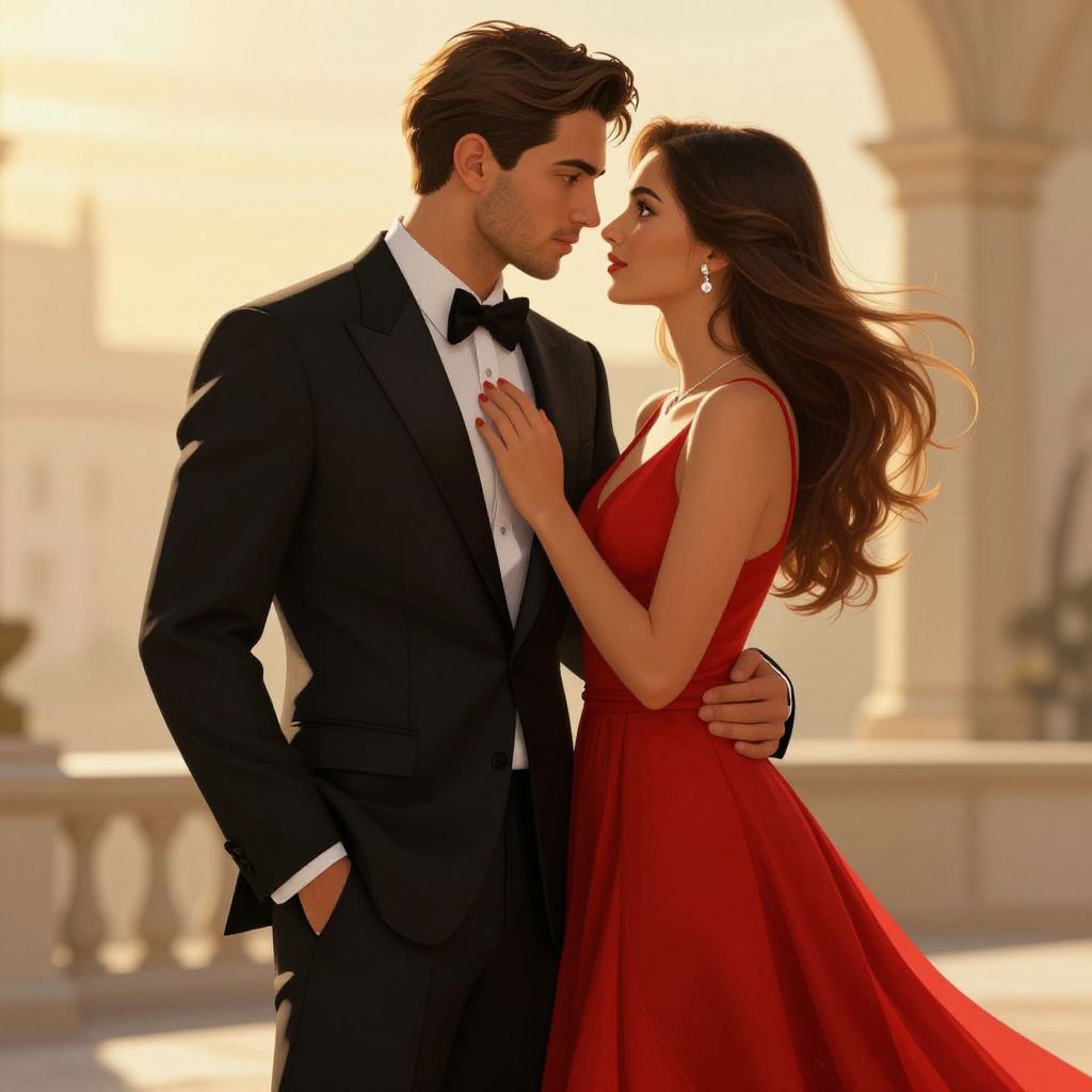 A digitally rendered, high-definition illustration captures a romantic moment between a man in a sleek black suit and a woman in a vibrant red dress, set against a softly lit, golden-hour backdrop with dramatic lighting effects, evoking a sense of intimacy and allure.