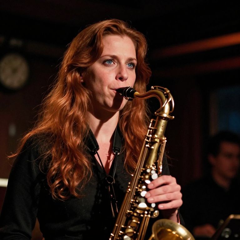 Photograph of a Caucasian woman with long, wavy auburn hair, playing a golden saxophone on stage. She has fair skin and blue eyes, wearing a black blouse with a slightly open collar. The lighting casts a warm glow on her face, highlighting her expressive eyes and soft features. The background is dimly lit, with indistinct figures and dark wooden panels, creating a cozy, intimate concert setting. The saxophone's shiny surface reflects the stage lights, adding a touch of elegance to the image.