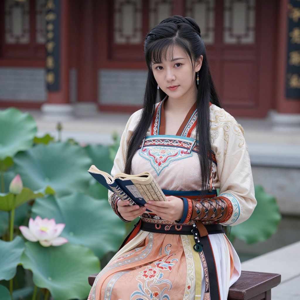 A realistic portrait of a Chinese woman in her 30s, with long black hair and a calm, proud expression, wearing a classic Mulan Princess costume with traditional Chinese motifs, embroidered silk, and a warrior's belt. She is seated on a wooden stool in an ancient temple garden, a book open in her hands, as lotus flowers bloom in the foreground.. The woman has big tits and cute face