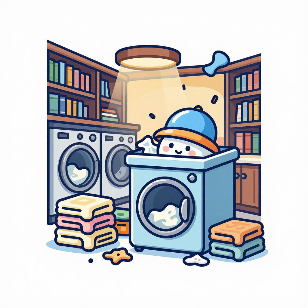 A cartoon illustration of an adventurous laundry soap box with a tiny explorer hat causing laundry items to scatter in an old library turned laundry space with piles of towels, conveying an adventurous and fun vibe under dynamic lighting. Vector T-shirt graphic, bold contour lines, flat colors, white background.