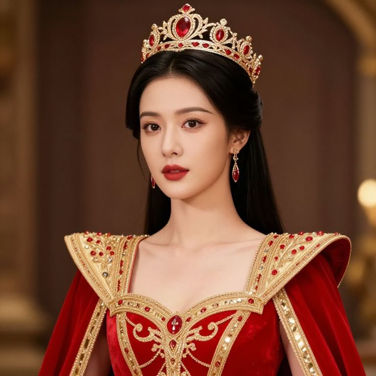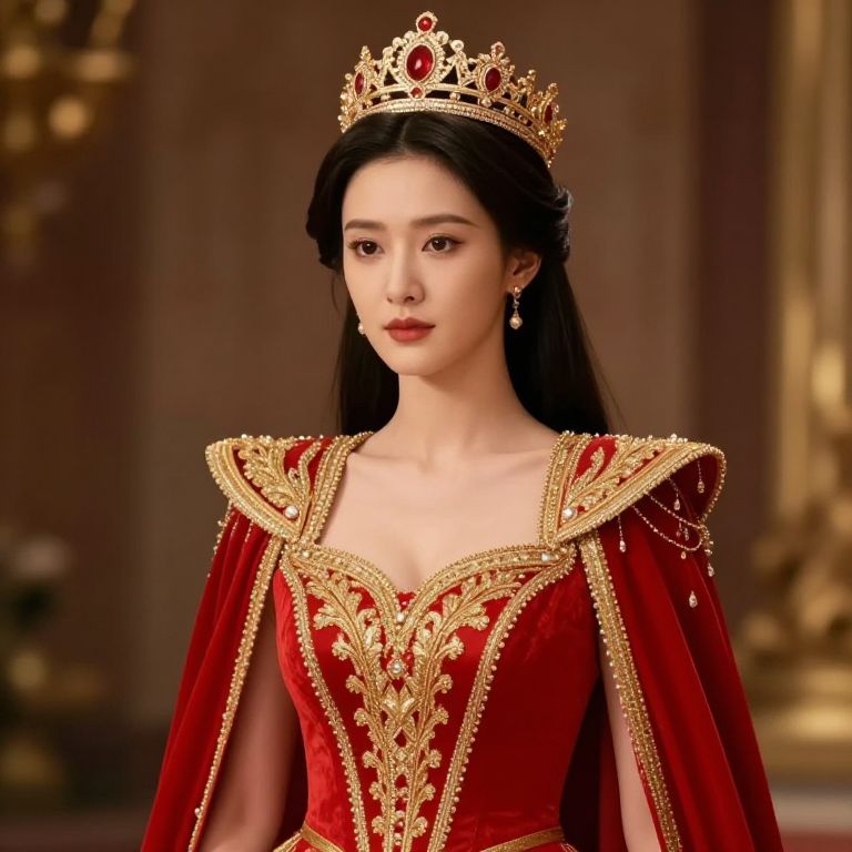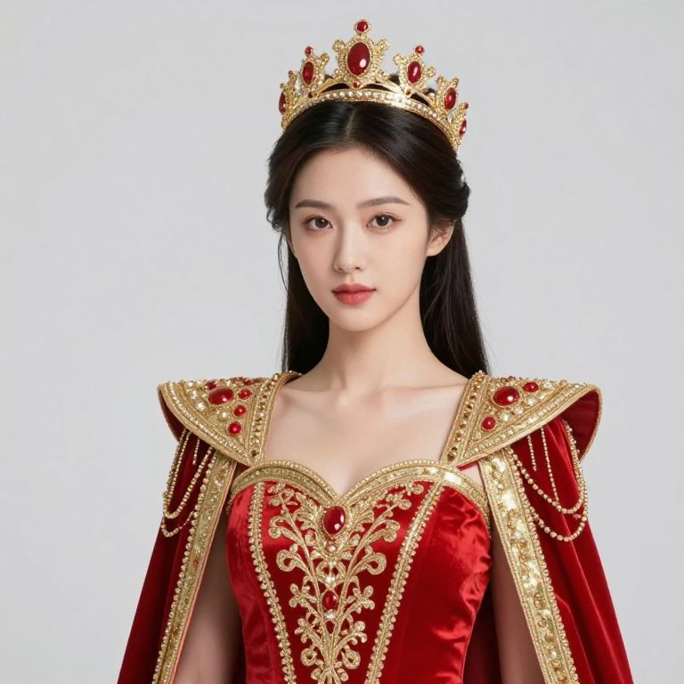 Female wearing a red and gold outfit with a crown on her head.