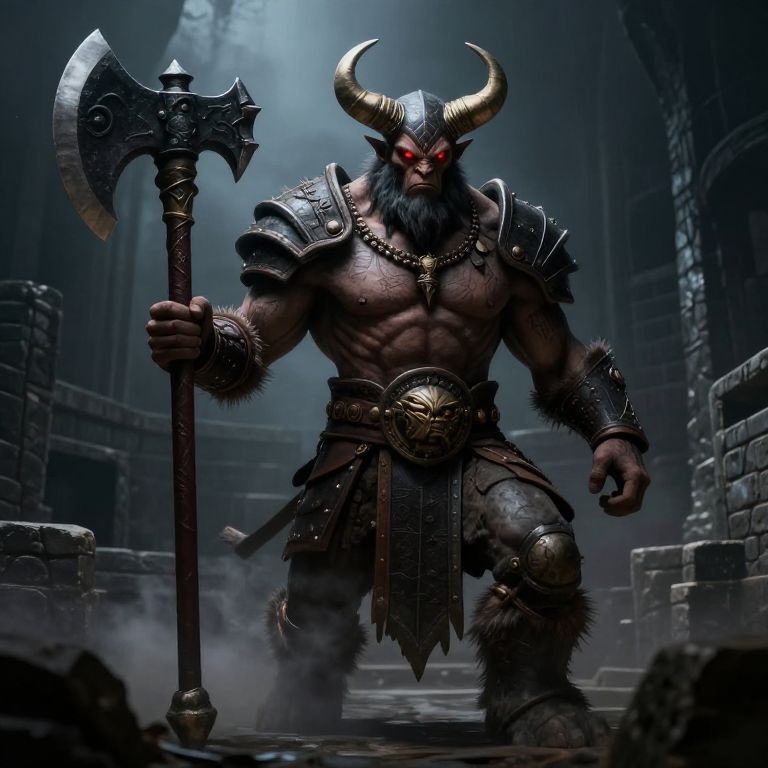 DND minotaur art depicting a fierce warrior standing in a dark labyrinth, muscular body covered with tribal armor and wielding a massive battle axe, glowing red eyes, smoky atmospheric lighting, fantasy style, highly detailed, epic composition