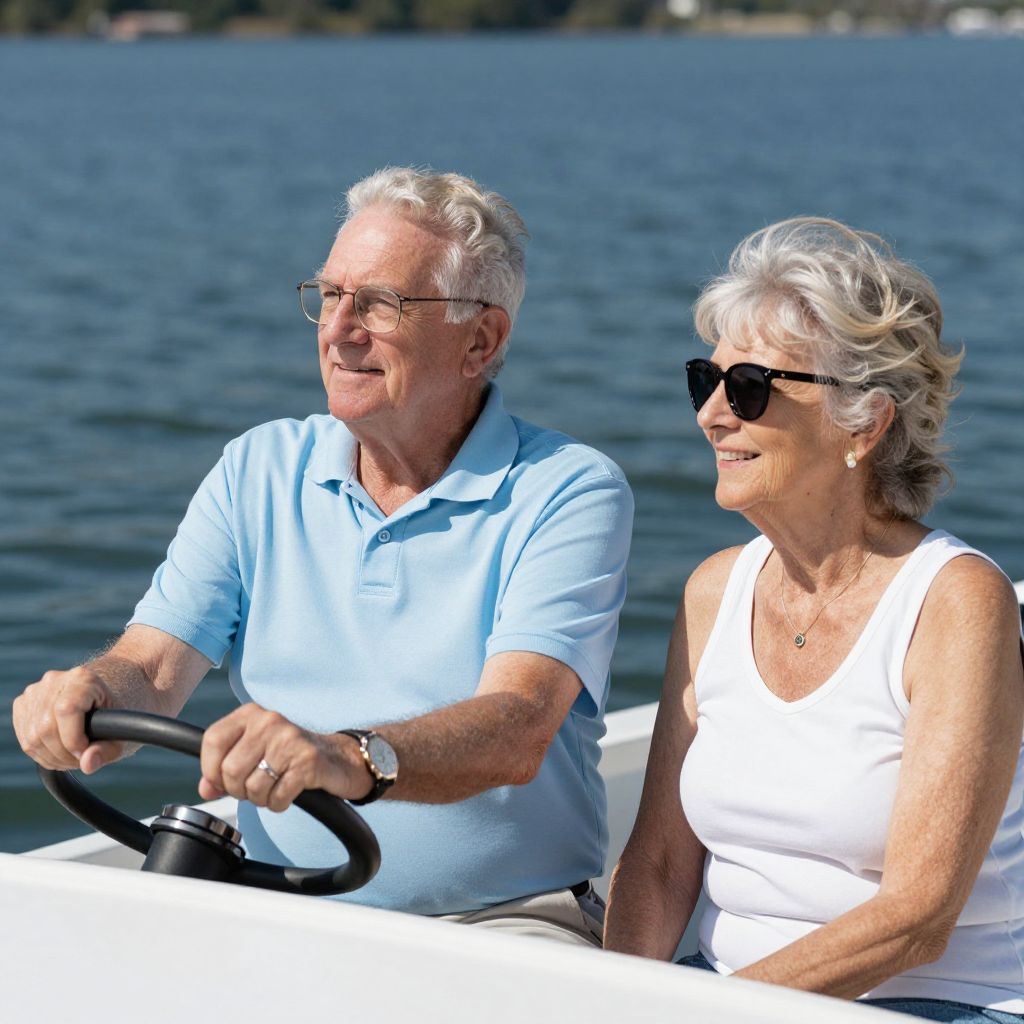 Sunny day finds a cheerful senior couple steering a boat together, with the man in a light blue polo shirt and glasses at the helm and the woman in a white tank top and sunglasses smiling beside him, both enjoying the tranquil waters ahead.