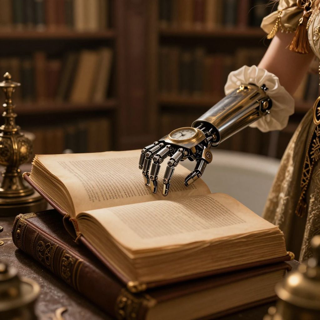 A photograph featuring a close-up of a vintage library setting with a focus on a robotic hand with articulated metal fingers resting on an open, aged book. The book is placed atop a stack of old, leather-bound books on a wooden table. The robotic hand has a silver, metallic finish with detailed joints, and it is adorned with a white, ruffled cuff. The background is blurred, showing shelves filled with more books. The lighting is warm, highlighting the textures of the leather and metal. The scene evokes a steampunk aesthetic, blending vintage and futuristic elements.