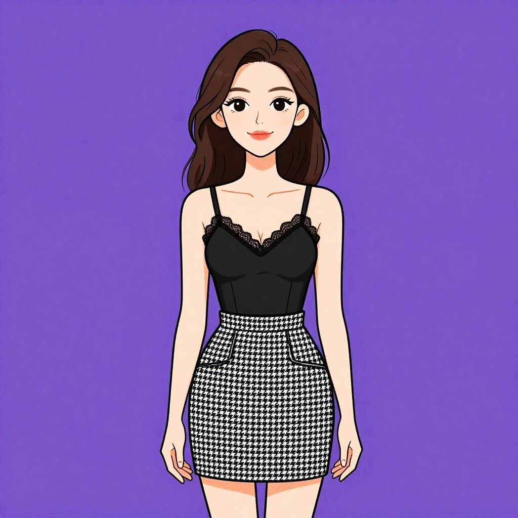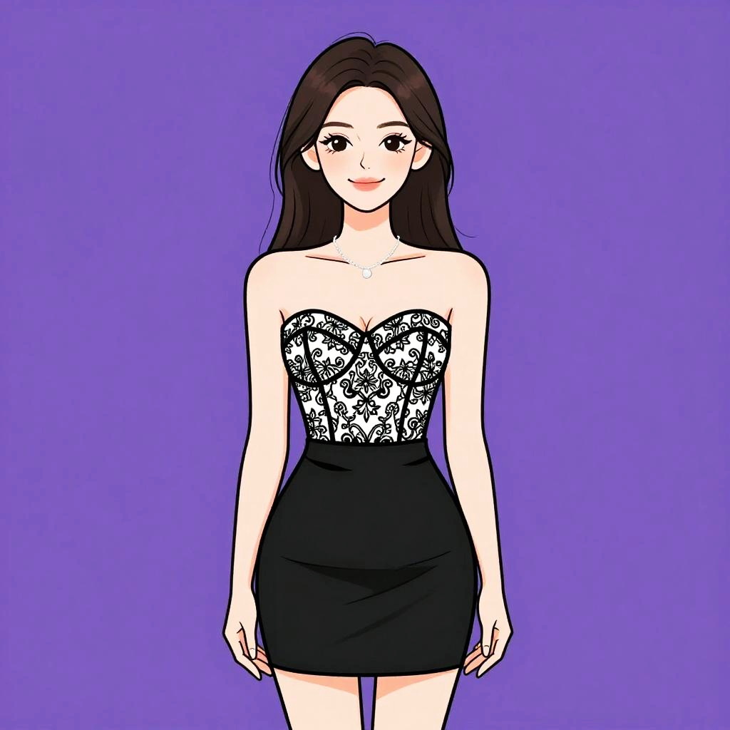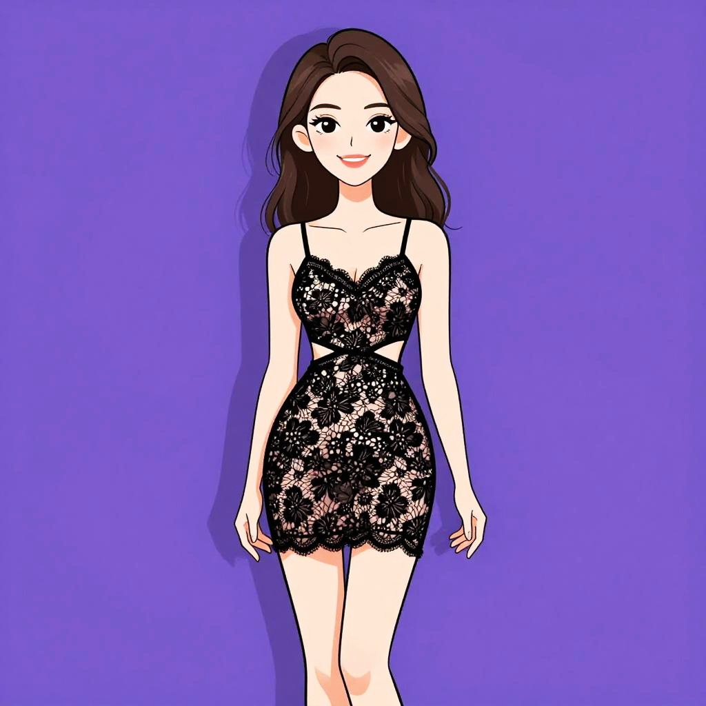 Woman with pretty face and pretty hair. Woman, girly, black lace top with long sleeves, pale pink skirt, short A-line silhouette, round neckline, natural waistline. --sref 1467