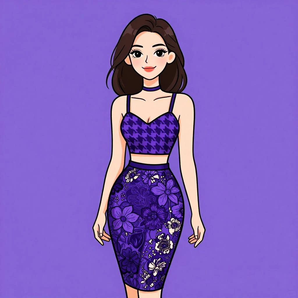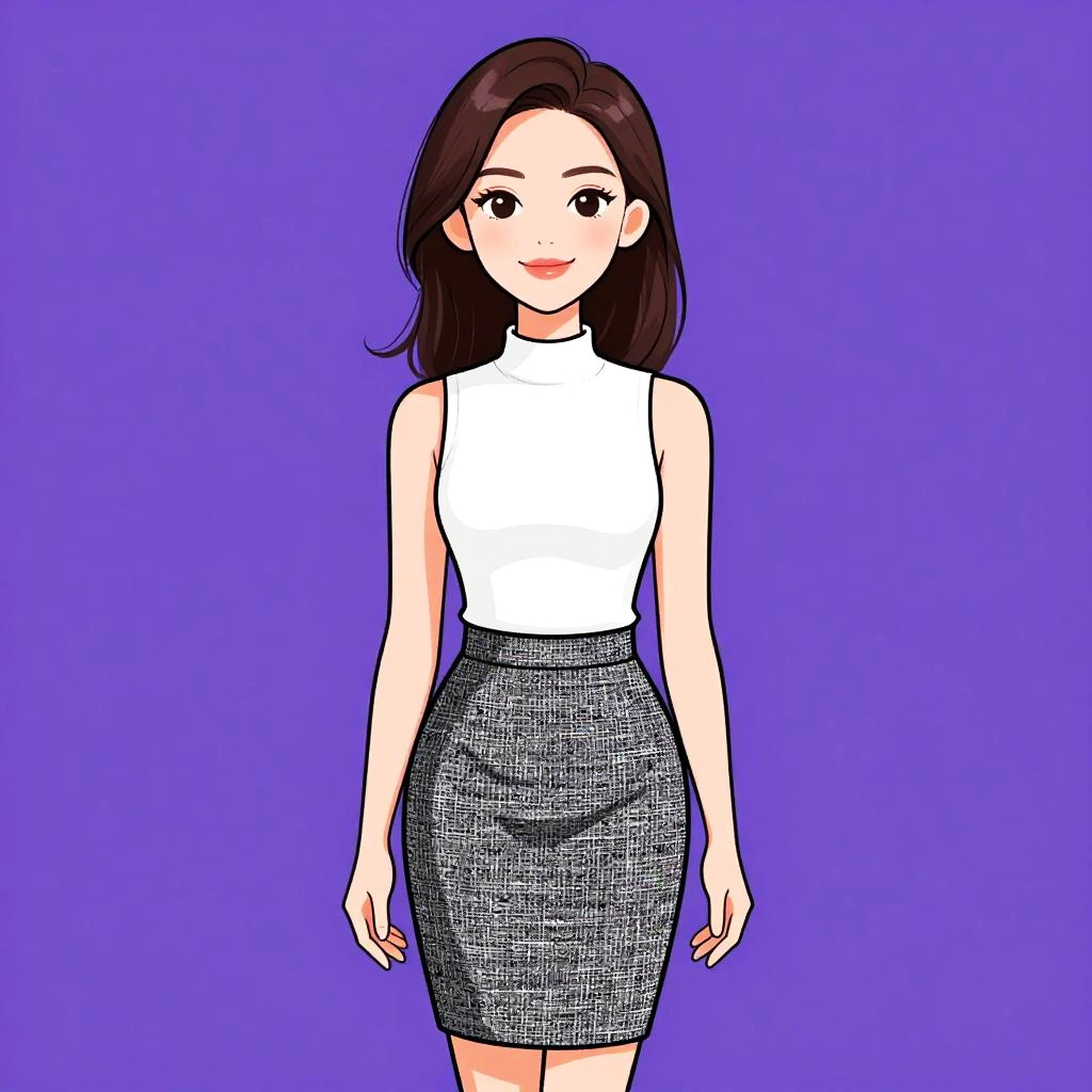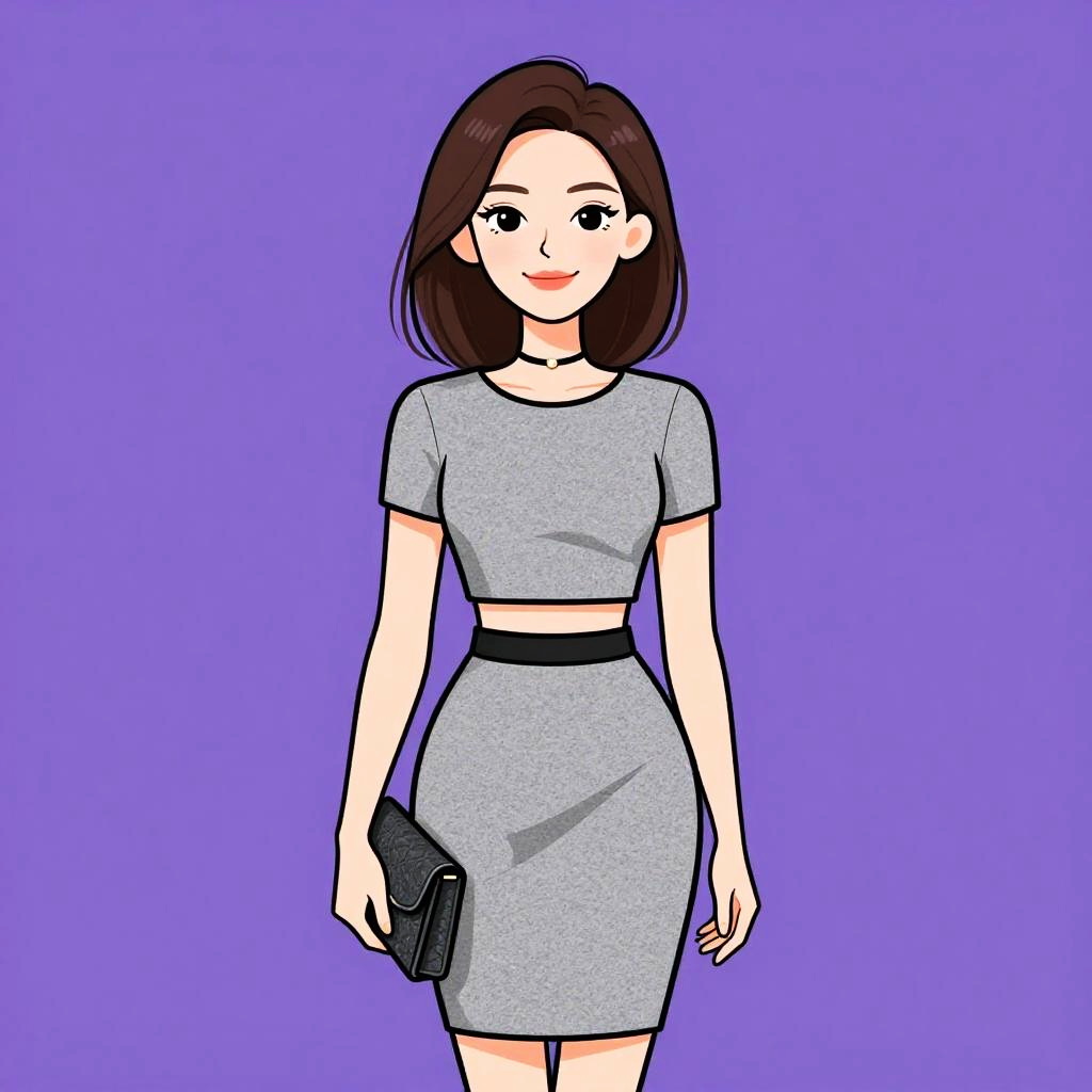 Woman with pretty face and pretty hair. Woman, girly, black lace top with long sleeves, pale pink skirt, short A-line silhouette, round neckline, natural waistline. --sref 1467