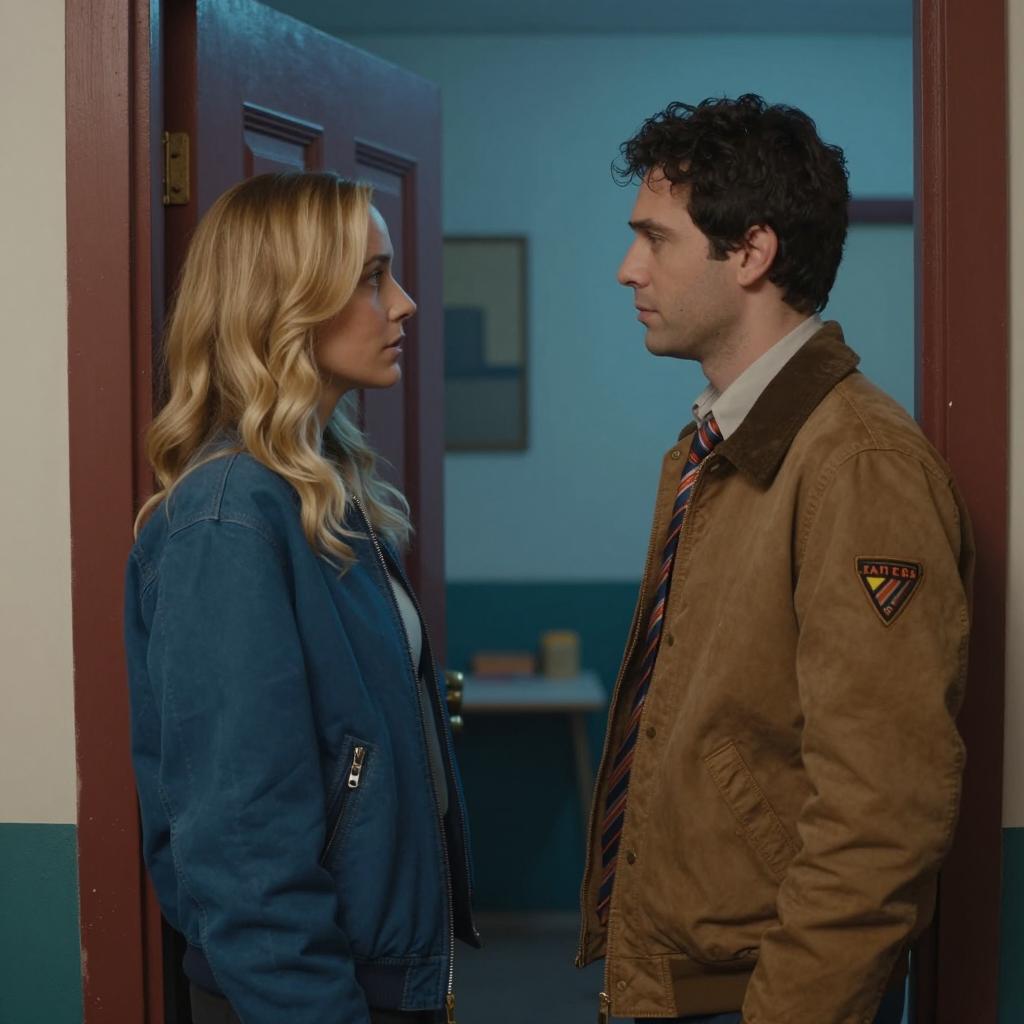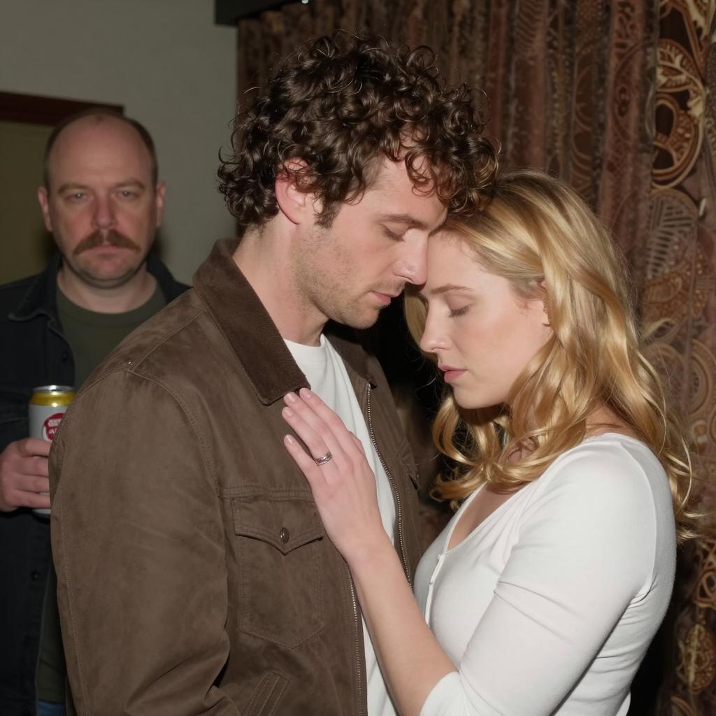 Three people in a dimly lit room. A man with curly hair and a brown jacket stands close to a blonde woman in a white top, his head tilted down, eyes closed. Another man with a mustache and balding head stands in the background, holding a beer can, partially obscured by a patterned curtain. The woman's hand rests on the man's chest. The man in the background has a neutral expression.