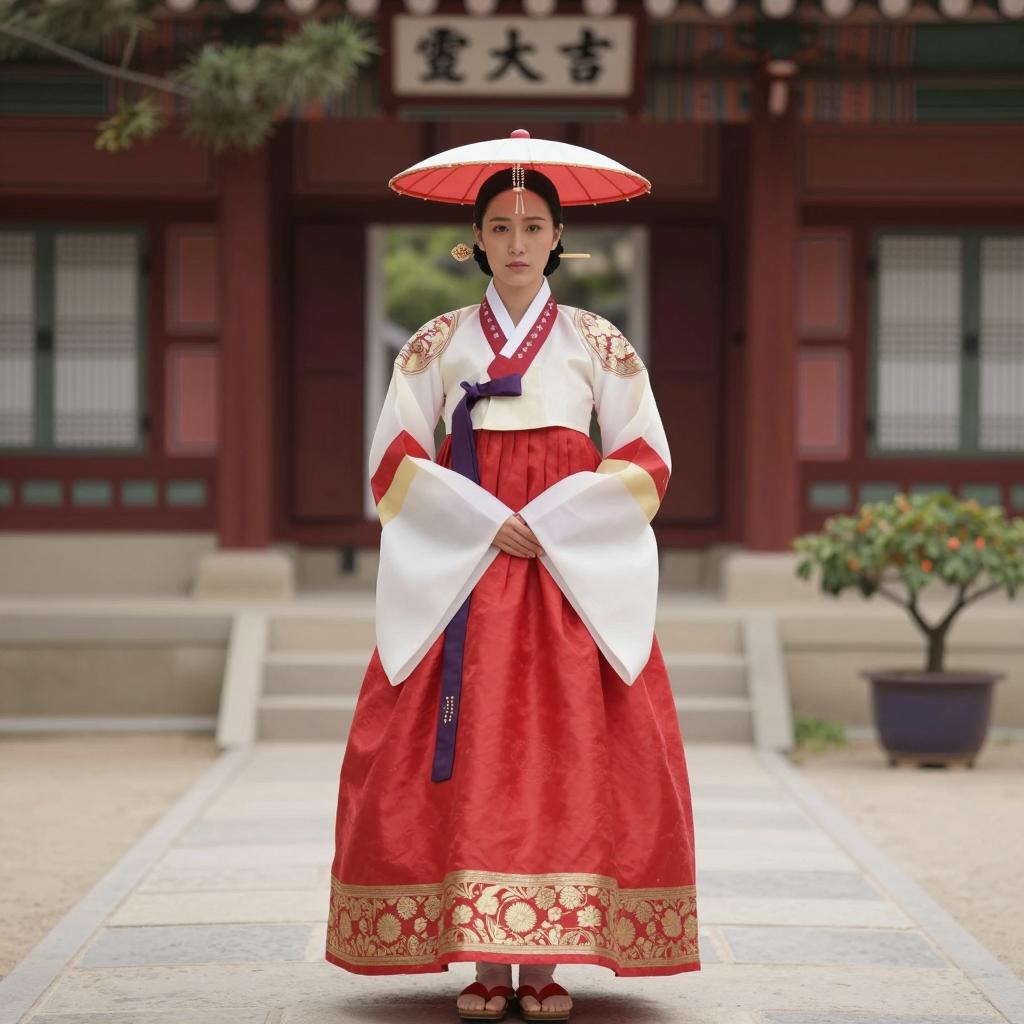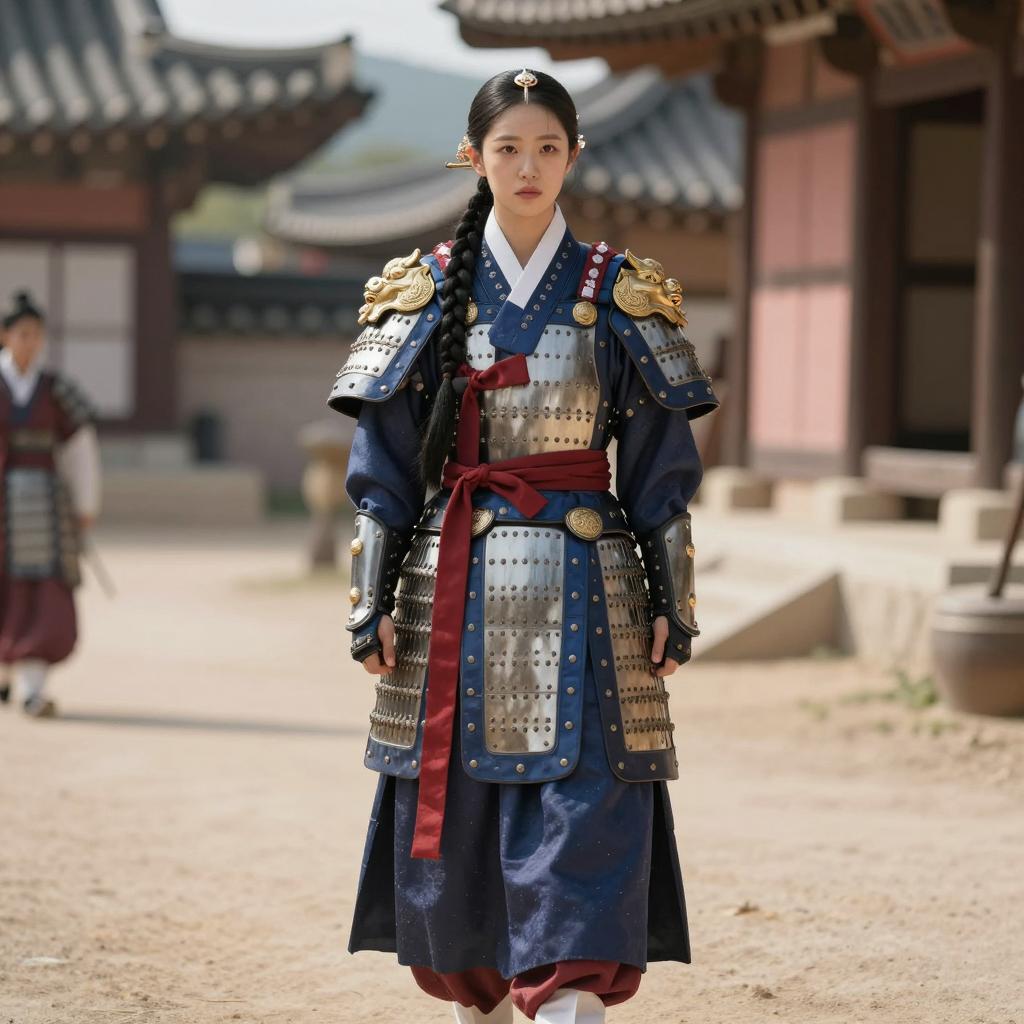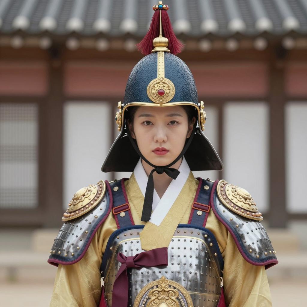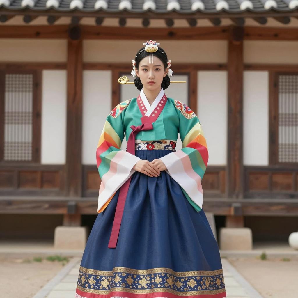 Dressing costume girl, photograph of a young woman, wearing traditional Korean royal attire, detailed embroidered blue robe, gold and red accents, large gold crown with red flower, long yellow and red sash, serious expression, medium-length brown hair, soft sunlight, blurred background of traditional building, realistic style, high detail, cultural costume, portrait orientation