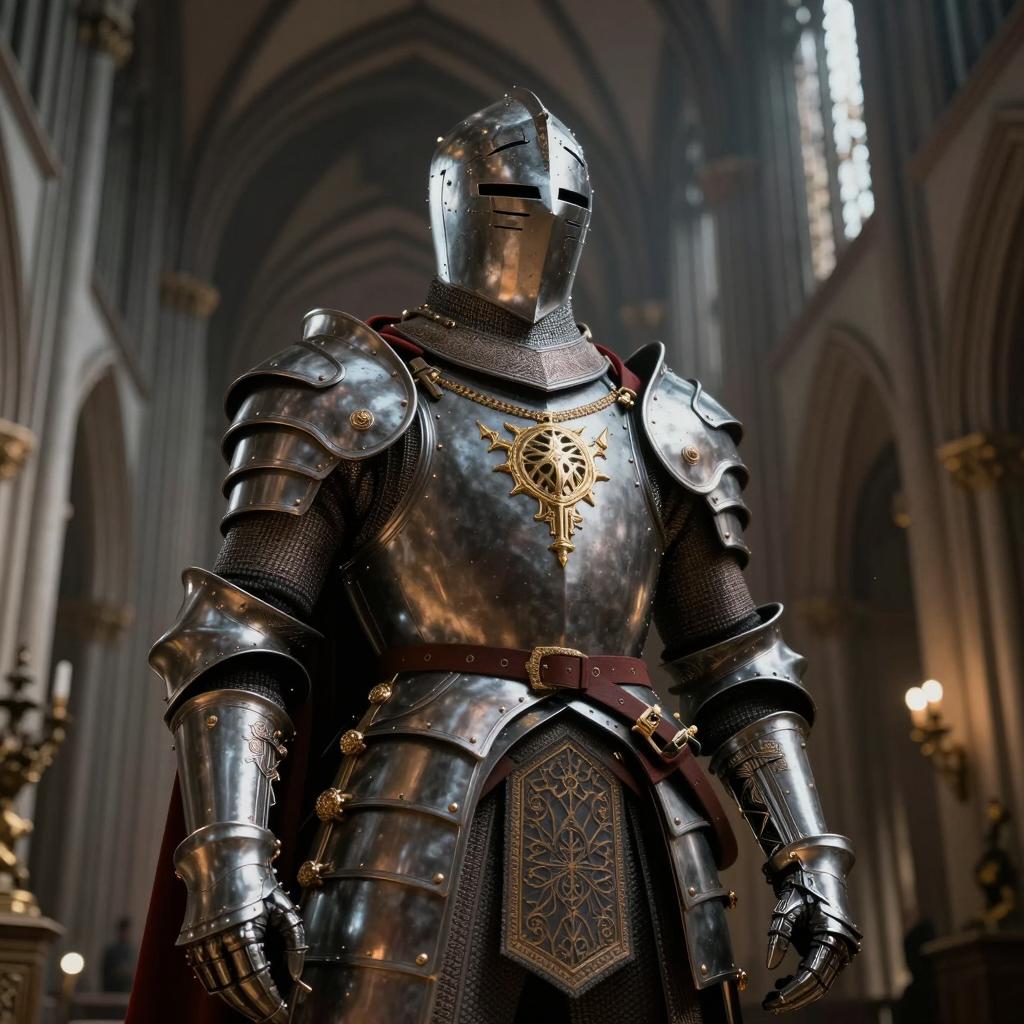 Detailed portrait of a knight wearing ornate, polished steel armor with gold embellishments standing inside a dark Gothic cathedral. The armor includes a closed helmet, shoulder plates, and intricate designs on the chest and gauntlets. The cathedral interior features tall pointed arches and candelabras, creating a dramatic and atmospheric setting.