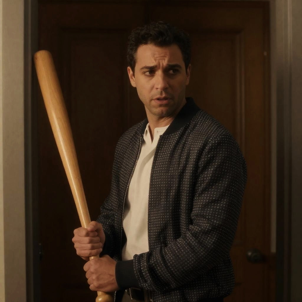 Photograph of a man with short, dark hair, holding a wooden bat. He has a slightly worried expression, wearing a dark jacket with a white geometric pattern over a white shirt. He stands in a dimly lit doorway, with wooden panels in the background. The lighting is warm, casting soft shadows. The man is positioned slightly to the right, looking to the left.
