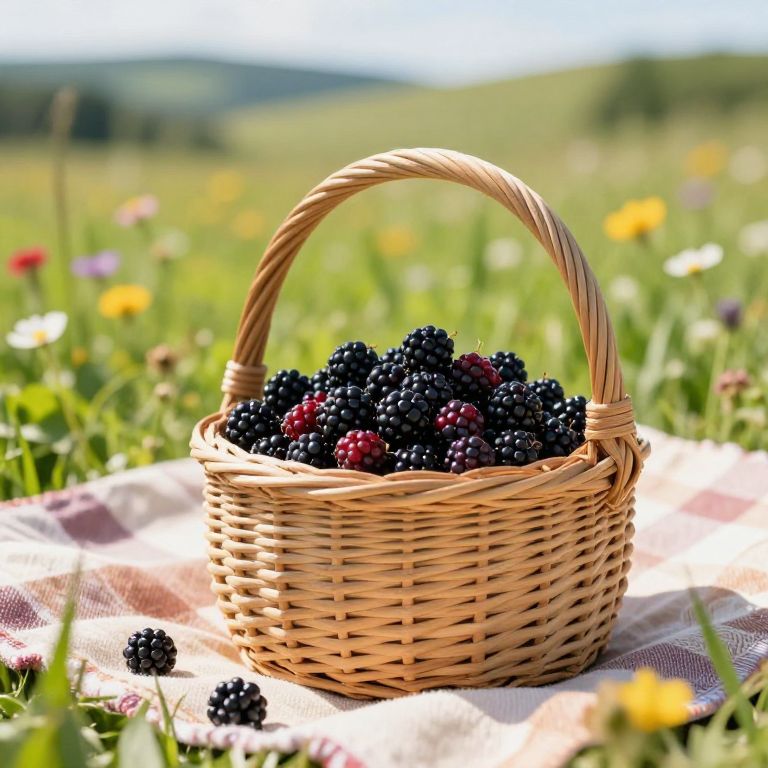 Blackberries harvested in a woven basket placed on a picnic blanket in a sunlit meadow, vibrant summer colors with wildflowers around, soft focus background blending into rolling hills, realistic style emphasizing freshness and abundance, warm joyful mood.