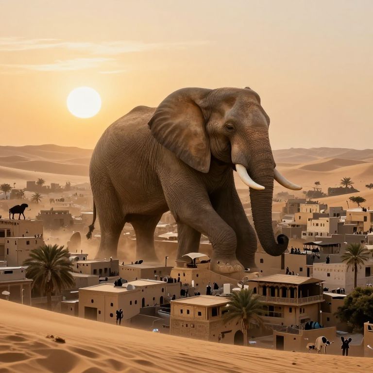 Photograph of a giant elephant standing amidst a desert village at sunset, with sand dunes, palm trees, and small, beige buildings in the background
