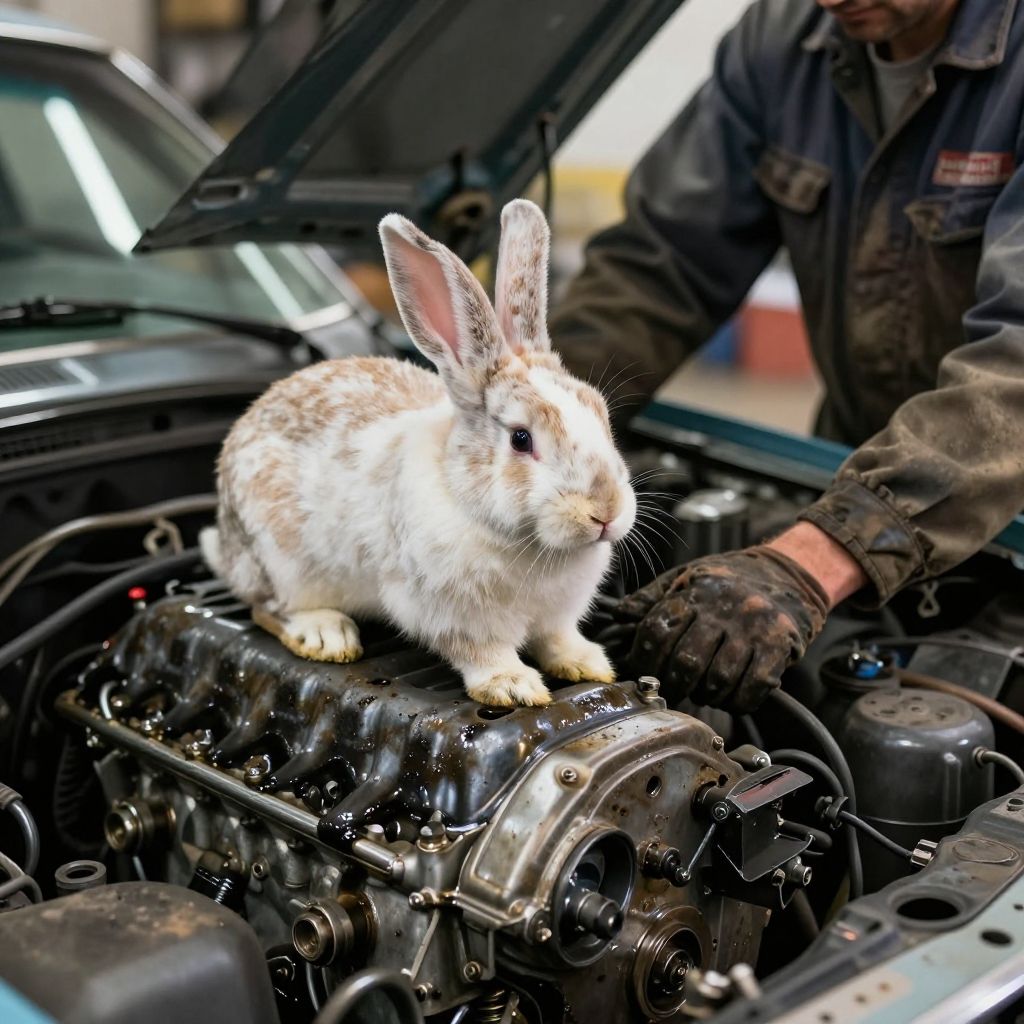 Photograph of a white and brown rabbit with large ears standing on a black engine block, surrounded by car parts and wires. A mechanic, wearing a dark blue jacket and black gloves, is partially visible on the right, reaching into the engine bay. The car's hood is open, revealing the engine and the rabbit's soft fur contrasts with the shiny, metallic engine components. The background is slightly blurred, emphasizing the rabbit and the engine.