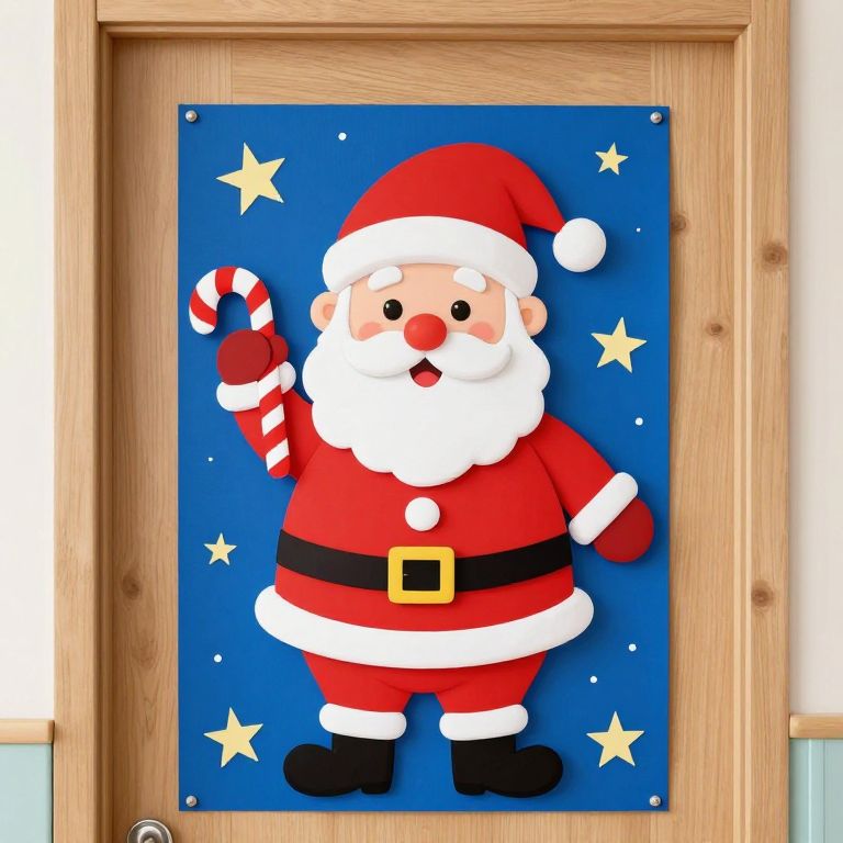 A vibrant cartoon-style Christmas decoration featuring a cheerful Santa Claus holding candy canes, set against a festive blue background with stars and a retro aesthetic, perfect for a preschool classroom door.