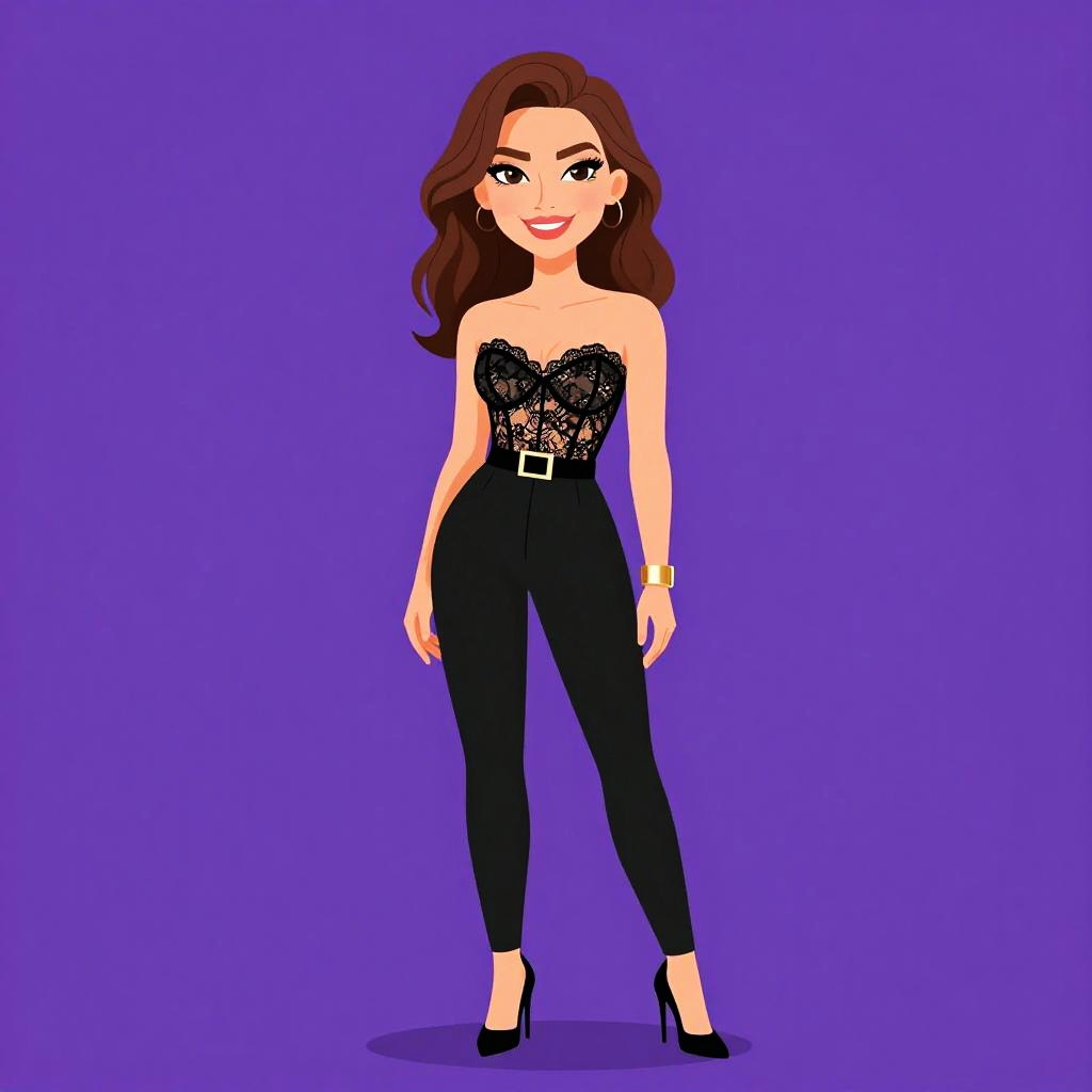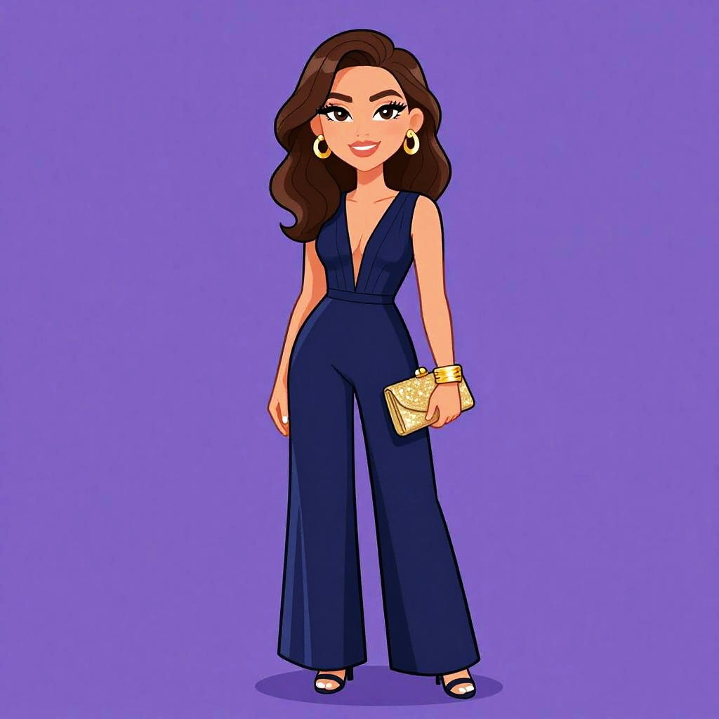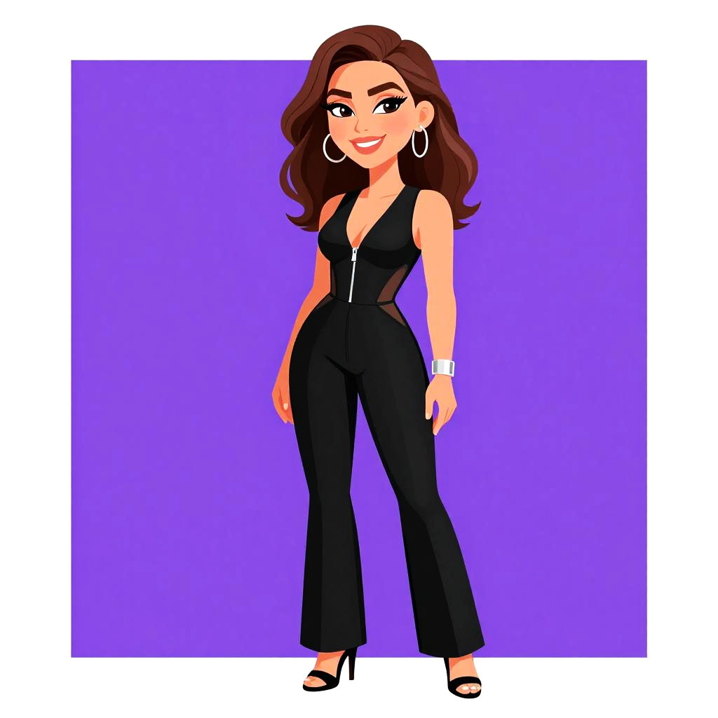 Woman with pretty face and pretty hair. smiling Woman, chic, sleeveless black jumpsuit with a plunging neckline and mesh side cut-outs, fitted silhouette, full-length trousers, frontal zipper closure, paired with black open-toe high heels, accessorized with a silver arm cuff. --sref 1467