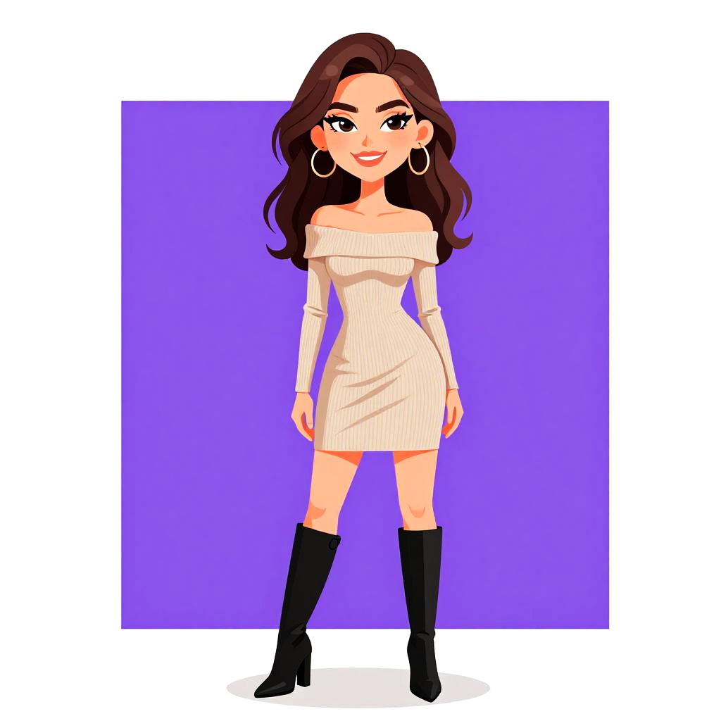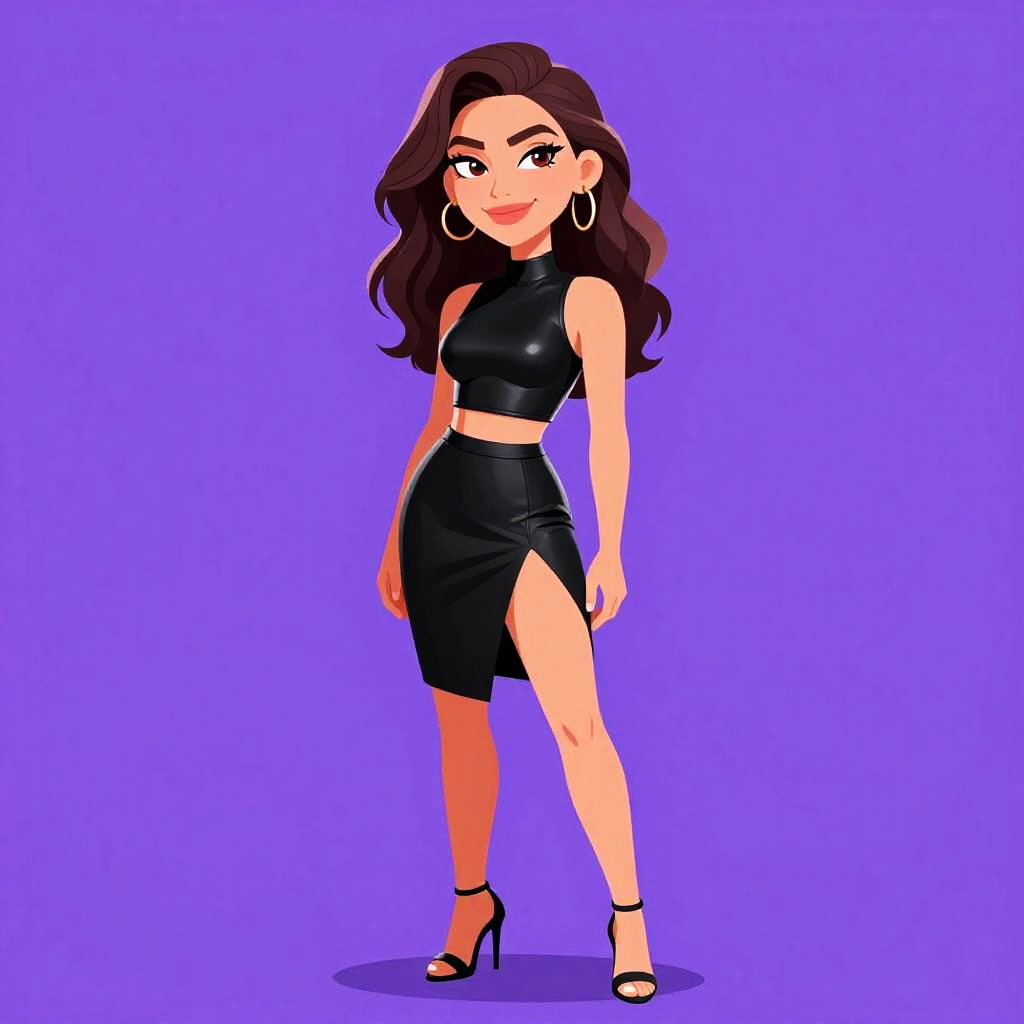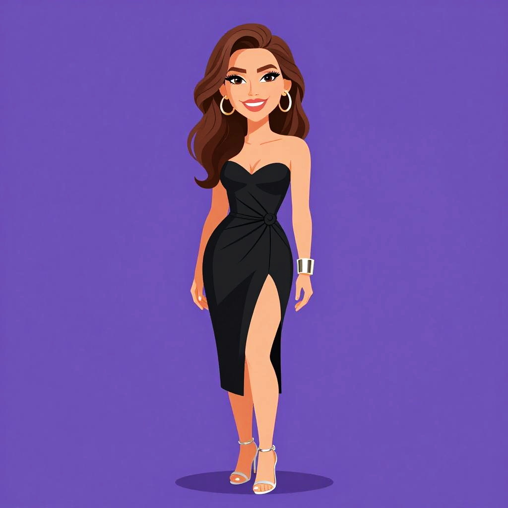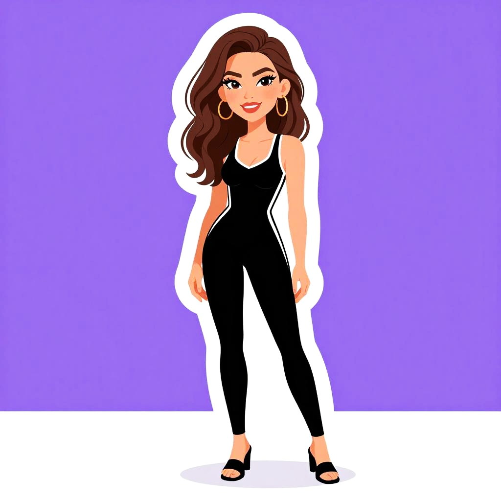 Woman with pretty face and pretty hair. smiling Woman, chic, sleeveless black jumpsuit with a plunging neckline and mesh side cut-outs, fitted silhouette, full-length trousers, frontal zipper closure, paired with black open-toe high heels, accessorized with a silver arm cuff. --sref 1467
