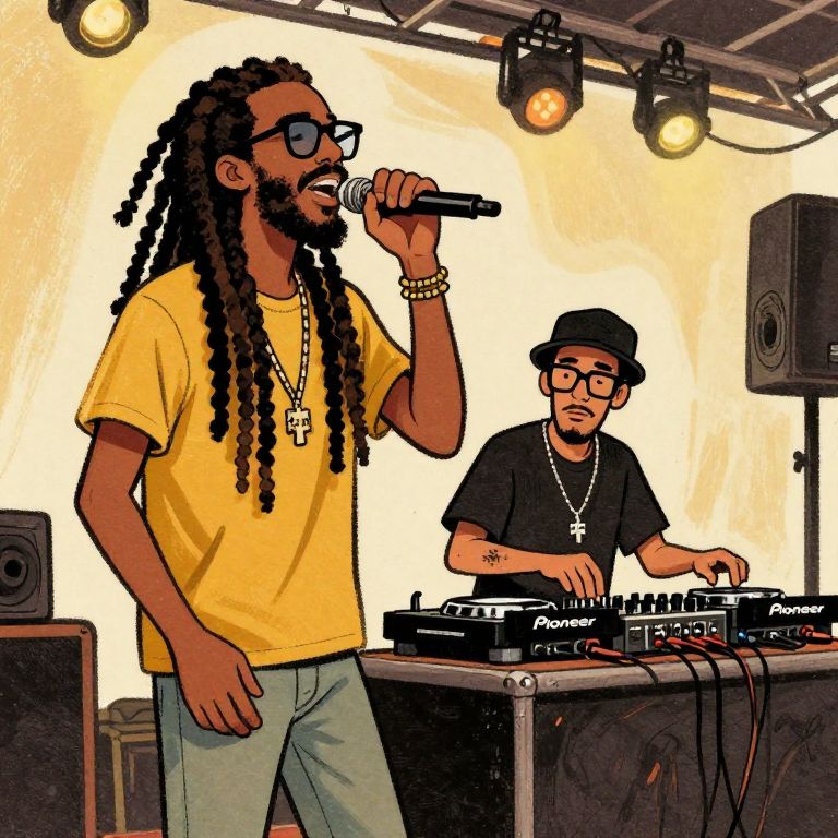 Vintage Art cartoon style, concert scene, a tall rasta guy without glasses sings, and a lince guy with glasses behind who mixes on a pioneer ddj,