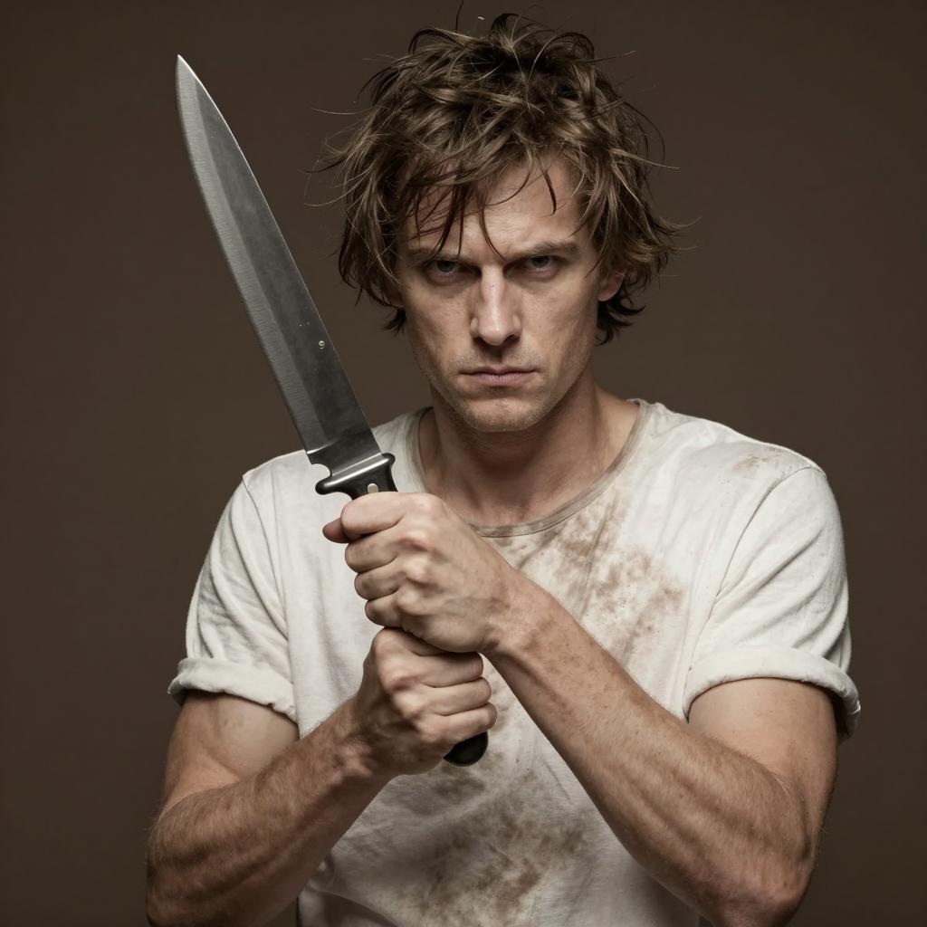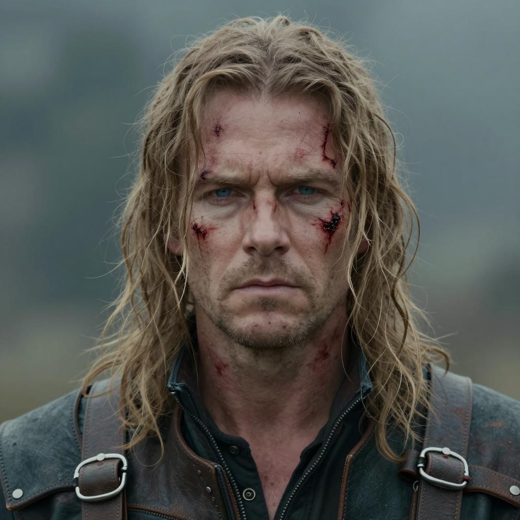 Close-up portrait of a blonde man with messy hair wearing a green jacket and black shirt, with a visible red bruise on his right cheek. He has a serious expression and looks slightly to the left. The background is blurred with indistinct shapes, focusing attention on the man.