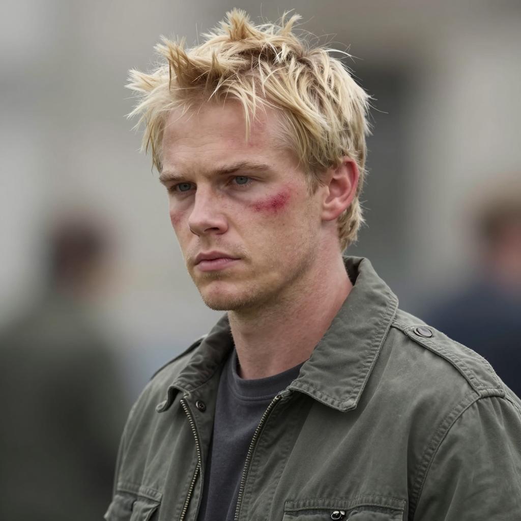 Blonde man with messy hair, wearing a green jacket, has a red bruise on his right cheek. He looks slightly to the left with a serious expression. Background is blurred with indistinct shapes. His right shoulder is slightly raised. The man is the only person in the image.