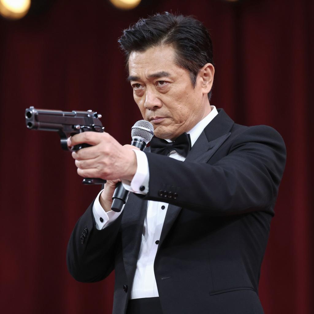 Middle-aged man in black suit and tie, right hand pointing a smoking gun forward. Background: dimly lit bar, neon signs, potted plant, metal shelves with glasses. Intense expression, cigarette smoke, urban setting.