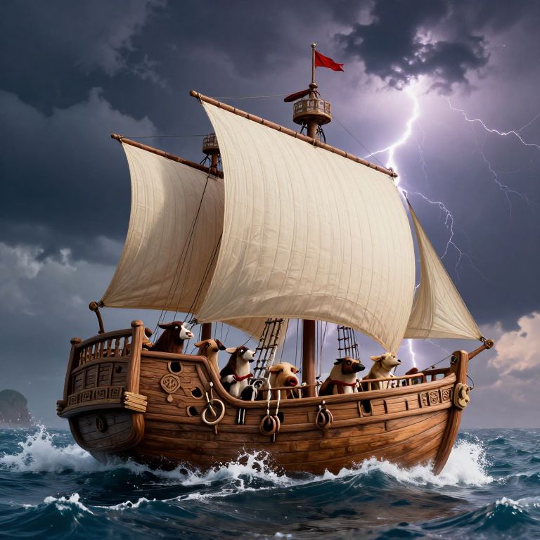 Noahs ark sailing on a stormy sea, detailed wooden ship with animals peeking out, dramatic sky with lightning, vibrant colors, epic biblical scene, ultra-realistic texture, high resolution