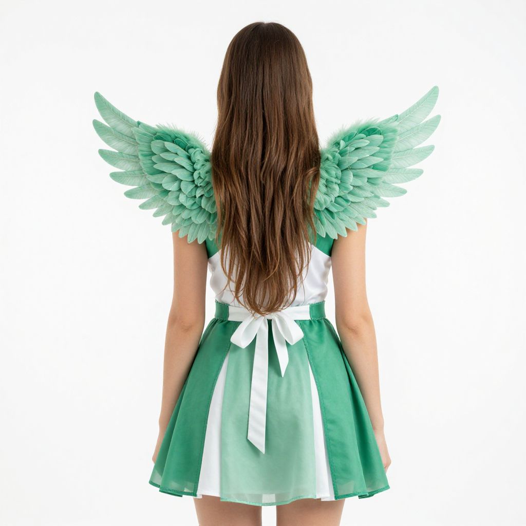 Woman with long brown hair wearing a green and white dress with wings on her back.