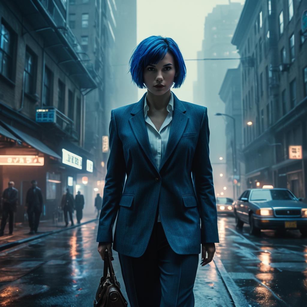 Realistic photo.A cyberpunk scene featuring a mysterious female detective with short blue hair, set in a foggy cityscape, wearing a tailored blazer and dress pants, hyper-realistic, ray tracing, dynamic lighting, high detail