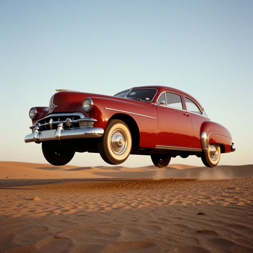 Photograph of a red, vintage 1950s car with chrome details, flying over a sandy desert at sunset, wheels kicking up sand.