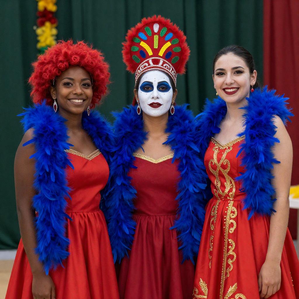 Photograph of three women in vibrant costumes. First woman, dark-skinned with red wig, red dress, blue feather boa. Second woman, pale, white face paint, red headdress with colorful designs, blue feather boa. Third woman, fair-skinned, red dress with gold patterns, blue feather boa. All smiling. Background includes green curtains and festive decorations.